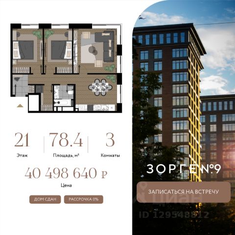 "Зорге 9" — готовый квартал апартаментов с премиальными сервисами на Ходынке. В трех корпусах с панорамными окнами предусмотрены уникальные форматы площадей, удовлетворяющие самый взыскательный вкус. В 7 минутах ходьбы от "Зорге 9" расположены 4 станции метро: Полежаевская", "Хорошевская", "Зорге" и "Хорошево". До делового центра "Москва-Сити" 10 минут на автомобиле. Простота форм, строгие линии, панорамные окна, архитектурное освещение и арт-объекты поддержат атмосферу роскоши и комфортной жизни на Ходынке. Именно за яркую архитектуру апарт-комплекс "Зорге 9" получил престижную международную премию European Property Awards. Комплекс полностью введен в эксплуатацию. "Зорге 9" — территория инноваций. Высокие потолки и панорамные окна Guardian ClimaGuard Solar с энергоэффективным "умным" напылением. Предусмотрен ряд премиальных сервисов: вход по Face ID, мобильное приложение резидента, дающее доступ ко всем услугам в один клик, 500 видеокамер на территории, двухуровневый подземный паркинг с автоматическим шлагбаумом, зарядкой для электромобилей, велосейфом и станцией подкачки шин. В "Зорге 9" можно рассмотреть варианты площадей от 27 до 81 кв. м, свободной планировки, с окнами в пол и высотой потолков 3,15 м, а также уникальные форматы пространств. Апартаменты с террасами позволят создать дополнительное рабочее пространство или зону отдыха на свежем воздухе, а тканевые маркизы помогут создать тень и повысить уровень приватности. Угловое остекление станет особой изюминкой и украсит любой интерьер. На последних этажах предусмотрены пентхаусы с каминами и выходами на кровлю: от 150 кв. м жилья high-уровня с максимальным уровнем инсоляции — на потолках в пентхаусах появятся так называемые "световые фонари". "Зорге 9" СДАН, все корпуса введены в эксплуатацию. Продам 3-комнатную квартиру с отделкой от застройщика станция Зорге (МЦК).
