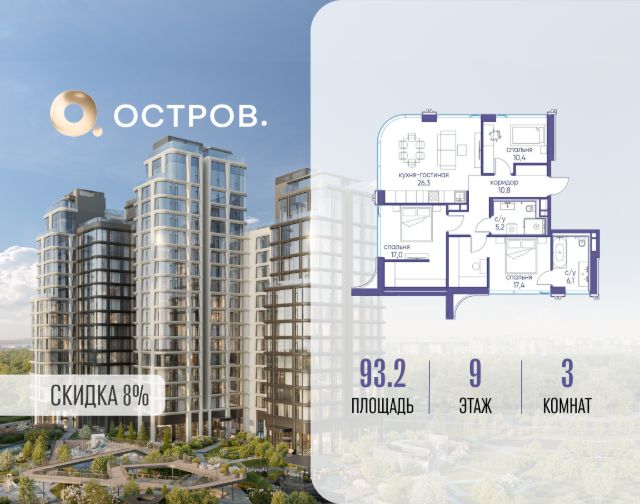Цена указана с учётом скидки при 100%-й оплате, несубсидированной ипотеке, рассрочке (кроме программы "Рассрочка 0%"). В жилом квартале продаётся 3-комнатная квартира площадью 80.50 кв.м white box. Квартира расположена на 14 этаже 48 этажного корпуса 1 в жилом комплексе комфорт класса Левел Звенигородская (компания Level Group/Левел групп). Отличная транспортная доступность - 5 мин. пешком до метро "Звенигородская" (откроется к окончанию строительства); - 18 мин. пешком до станции МЦК "Хорошёво" и станции БКЛ "Народное ополчение"; - 4 мин. на авто до ТТК; - 8 мин. на авто до Садового кольца; - 15 мин. на авто до Кремля. Продуманный архитектурный проект - Концепция от студии Станислава Михаловского, в основу которой легло единение природы и города; - Двухкамерные стеклопакеты в окнах, алюминиевый и ПВХ профиль - в квартирах тепло зимой и прохладно летом; - С верхних этажей откроются панорамные виды на город, Москву-реку, "Москва-Сити" и Москворецкий парк; - Лобби со всеми удобствами: окна в пол, высокие потолки до 4,7 м, лаунж-зоны, колясочные, гостевые санузлы и мойки для лап животных; - Централизованные водонагреватели гарантируют круглогодичную подачу горячей воды в каждую квартиру. Благоустройство Концепция благоустройства разработана совместно с бюро UNK landscape. Высота башен приближается к 200 метрам - они словно касаются неба. Небесный простор проецируется на территорию двора с помощью подсветки, визуально увеличивая пространство и отражаясь в авторских элементах архитектуры. На территории площадью 0,45 га расположатся: - "Облако событий" - место встреч и общения; - "Облако спорта" - всё для поддержания себя в форме; - "Облако принятия решений" - пространство для работы на свежем воздухе; - "Облако спокойствия" - для отдыха в тишине природы; - "Облако игр" - площадки для подростков и самых маленьких. Инфраструктура В жилом комплексе откроется 21 коммерческое помещение: продуктовые лавки, кафе, салоны красоты, службы доставки и творческие студии. Этап 1 включает строительство двухуровневого подземного паркинга. Всего здесь расположится 351 машино-место, включая семейные места, и 264 кладовых помещения. В распоряжении жителей развитая инфраструктура района: 15 супермаркетов, 5 спортивных объектов, 9 медучреждений, 7 детских садов, 4 школы, 3 благоустроенных парка - всё в шаговой доступности. Инженерия Комфортное перемещение внутри домов будут обеспечивать надёжные лифты с доступом в паркинг с жилых этажей. В каждом корпусе предусмотрено до шести кабин, включая сервисные лифты. Попасть на территорию комплекса можно только по единому ключу доступа. Видеонаблюдение установлено на входах в подъезды, в лобби, в общих зонах, на въезде в паркинг. Гости смогут связаться с жителями дома через входные видеопанели, а управлять доступом на территорию можно через видеодомофон или приложение на телефоне. 3-комнатная квартира в новостройке с отделкой в районе Хорошево-Мневники в Москве.
