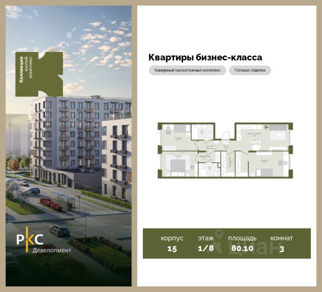 Агентам не звонить. Продается уютная 3-комнатная квартира на 1 этаже от застройщика. Общая площадь 80,1 кв.м. На выбор представлены 3 вида дизайнерской отделки с использованием качественных материалов. Высота потолков 3 м. Большая просторная кухня. "Коллекция" это камерный среднеэтажный жилой комплекс бизнес-класса в престижном экологически чистом районе Подмосковья. Прекрасная экология и живописная природа, отсутствие промышленных зон и вредных предприятий. В проекте планируется строительство 5 корпусов средней этажностью (4-8 этажей) с террасами и угловыми окнами, строительство собственной инфраструктуры: три детских сада, школа, поликлиника, физкультурно-оздоровительный комплекс. Жителям будут доступны машино-места в подземном паркинге, кладовые помещения. Ввод в эксплуатацию 3 кв. 2028г. Развитая инфраструктура: Детские площадки будут выполнены в природных материалах, игровые комплексы с бизибордами, развивающие игровые установки для игр с песком. Спортивная инфраструктура: столы для настольного тенниса, тренажеры, гимнастический комплекс. В пешей доступности находятся парк Дружба, загородный клуб "Moscow Country Club", парк имени Карбышева. Это располагает к приятным прогулкам и спокойному отдыху жителей комплекса. Транспортная доступность: 13 км от МКАД, 14 минут до МЦД-2 Нахабино, 26 минут до метро "Митино", 30 минут до метро "Пятницкое шоссе". В ближайшей перспективе - расширение местной дорожной сети и запуск новых маршрутов до ж/д станций и станций метро.
