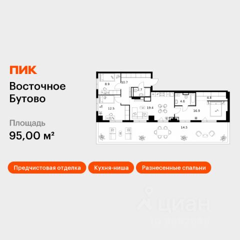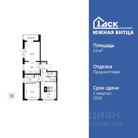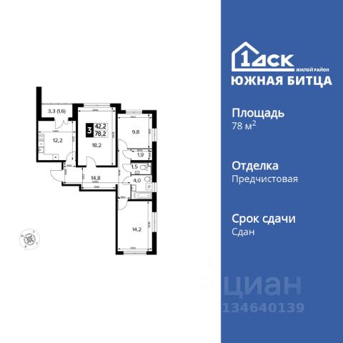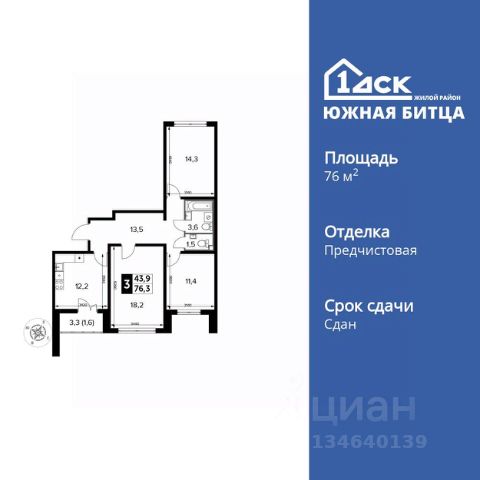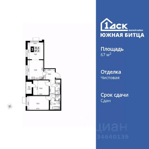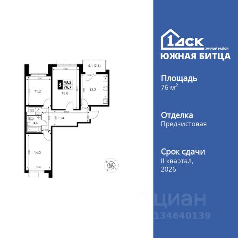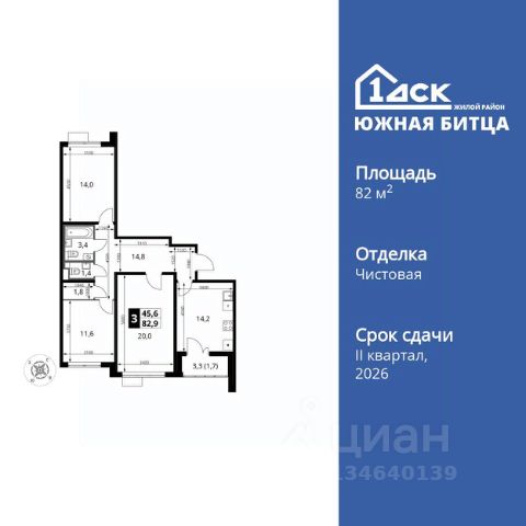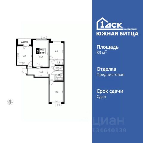 Продаётся 3-к квартира номер 581 общей площадью 84.1 кв.м. на 14-м этаже 23 этажного здания. Отделка Whitebox. Цена с учётом скидки.