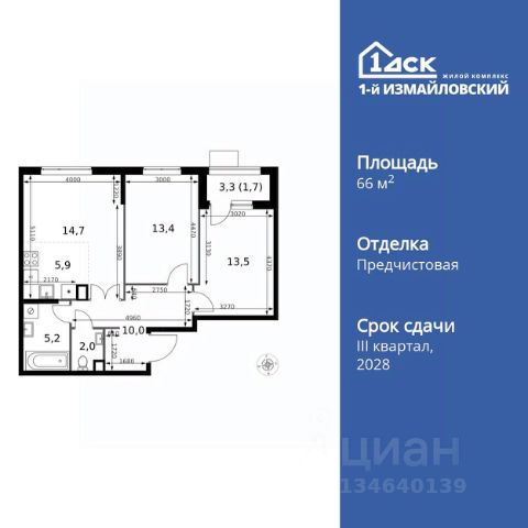 Прямая продажа от застройщика! Жилой Комплекс Комфорт класса. Продаётся 3-к квартира номер 274 общей площадью 66.4 кв.м. на 16-м этаже 25 этажного здания. Отделка Whitebox. Цена с учётом скидки. Особенности квартиры: - Просторная спальня, в которой можно разместить большую кровать. - Линейная планировка - максимальная функциональность и удобство. - Просторная ванная - место для расслабления и уединения. - Раздельный санузел - больше удобства для всех членов семьи. - Евроформат - просторное и удобное жилье с отличной планировкой. - Место для игры/занятия спортом - идеальное пространство для активных детей. - Можно оборудовать 2 или более рабочих места - пространство для нескольких человек. - Возможность добавить спальное место - дополнительный комфорт для гостей. - Ниша под шкаф - компактное и удобное место для вещей. - Лоджия - уютное место для отдыха и тишины. Квартира с предчистовой отделкой (White box). Вам не придется заниматься черновыми и трудоёмкими работы, а чистовую отделку и дизайн - сделайте на свой вкус. Информация о комплексе: Современный архитектурный проект "1-й Измайловский" - идеальное место для проживания, расположенное в восточной части Москвы в окружении 14 000 гектаров леса. Комплекс пронизан атмосферой здорового образа жизни и благополучия. Сиреневый сад и близлежащие лесопарки - это места, где можно насладиться лыжными прогулками зимой и тонизирующими пробежками летом. Расположенный между Щелковским шоссе и Амурской улицей, "1-й Измайловский" осмысляет себя не столько через близость к городским точкам притяжения, сколько через соседство с зелеными пространствами и спортивными объектами. Он отгорожен от шоссе застройкой первой линии и собственными садами здоровья. В его окнах - изумрудное море парка "Лосиный остров" и густые кроны окрестных дворов. В его графике - занятия спортом и прогулки в Измайлове. Транспортная доступность: Не более 2,5 км до станций метро "Щёлковская" и "Черкизовская" и МЦК "Локомотив". Щёлковское шоссе соединяет квартал с Северо-восточной хордой и МКАД, Центральным автовокзалом и Восточным железнодорожным вокзалом. Две автобусные остановки в паре минут ходьбы и 11 маршрутов общественного транспорта. На автомобиле 3 минуты до СВХ 12 минут до ТТК 15 минут до Садового кольца Внутренняя инфраструктура: Комплекс находится в исторически сложившемся районе Москвы с хорошим качеством и плотностью инфраструктуры. Торговые центры и сетевые магазины -6 детских садов, включая собственный детский сад на 125 мест -3 школы, включая собственную школу -Поликлиники и медицинские центры -Парки и зоны отдыха Расположение архитектурного проекта создает все условия для тех, кто стремится к здоровому образу жизни и для тех, кто уже сделал выбор в его пользу. В ближайшем окружении расположены несколько стадионов и множество спортивных объектов для занятий спортом на любой вкус: от всеми любимого футбола, баскетбола и до конного спорта. В окружении проекта более 30 километров
