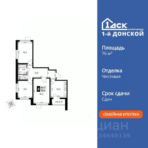 Продаётся 3-к квартира номер 198 общей площадью 76.8 кв.м. на 6-м этаже 24 этажного дома. Чистовая отделка. Дом сдан.
