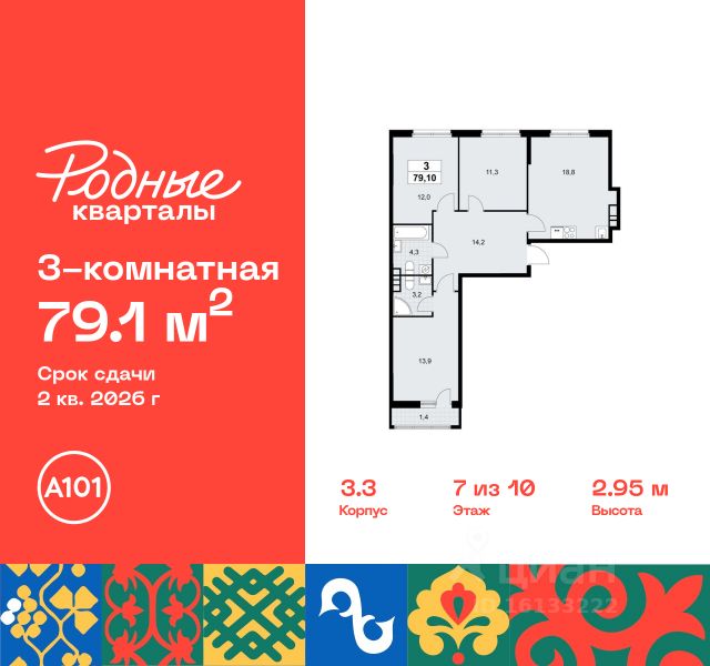 Продается трехкомнатная квартира 354 в новостройке Жилой район "Родные кварталы" по адресу Москва, ТиНАО, Новомосковский АО, Марушкинское С/П, жилой комплекс Родные Кварталы, 3.3, район Внуково, Новомосковский административный округ, Москва. Общая площадь квартиры - 79.10 кв. м., этаж 7 из 10, секция 8. Тип проекта, по которому построен дом - монолит, компания-застройщик - ООО "А101". Стоимость квартиры - 24331160 Р. Срок сдачи - 2 квартал 2026. ПРЕДЛОЖЕНИЯ ОТ ЗАСТРОЙЩИКА В ФЕВРАЛЕ 2026: Скидки до 10% на все квартиры. Только в офисах продаж до 28 февраля. Ипотека от 13,9 % для всех! На весь срок. "Семейная ипотека" вернулась. Ставка от 3,5 % на весь срок! Без удорожания! Выгодное ипотечное комбо: Ипотека от 2200 р./мес. и от 6 % после рождения ребёнка! Ипотека для всех "Держи пять!" - ставка 5 % на 2 года! *более подробную информацию по скидкам и акциям уточняйте в отделе продаж ЖК "Родные кварталы" строится в экологически благоприятной локации, рядом с парком Изварино и Ульяновским лесопарком. До станции метро "Аэропорт Внуково" и МЦД "Толстопальцево" - 15 мин. на транспорте. До Боровского, Киевского, Минского шоссе - 3, 6 и 20 минут соответственно Основная концепция благоустройства - воссоздание колорита разных регионов России. Этот же принцип использован в благоустройстве и озеленении района от бюро GAFA. Лесопарк, зоны отдыха, пешеходный бульвар со спуском в виде амфитеатра к набережной и центральной торговой площади, спортивные площадки. В шаговой доступности откроются детские сады и школа, поликлиника. На первых этажах домов - спортклубы, клиники, аптеки, супермаркеты, кафе и многое другое. Цветовые решения лобби также созвучны климатическим зонам России. Здесь появятся зоны ожидания с гостевыми санузлами и колясочными. Предусмотрены подземные паркинги и кладовые. Преимущества "Родных кварталов" - уютная атмосфера "малой родины" - полноценная инфраструктура внутри района - выезд на ключевые шоссе - от 3 минут на автомобиле - малоэтажная застройка