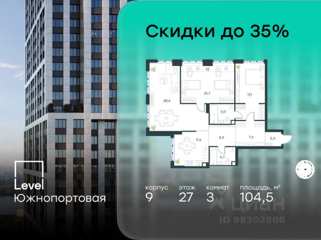 Цена указана с учётом скидки при 100%-й оплате, несубсидированной ипотеке, рассрочке (кроме программы "Рассрочка 0%"). В северной части района Печатники продается 3-комнатная квартира площадью 81.70 кв.м с отделкой white box. Квартира расположена на 5 этаже 49-этажного корпуса 9 в жилом комплексе комфорт-класса Level Южнопортовая (компания Level Group/Левел групп). Отличная транспортная доступность: - 10 мин. пешком до станции метро "Кожуховская"; - 20 мин. пешком до станции МЦК "Дубровка"; - 3 мин. на авто до ТТК; - 13 мин. на авто до Садового кольца; - 15 мин. на авто до Бульварного кольца. Продуманный архитектурный проект: - авторская архитектура от бюро СПИЧ; - уникальные виды на реку, парки и достопримечательности города; - высота потолков в квартирах до 6 м; - окна высотой до 1,87 м с высоким коэффициентом сопротивления теплоотдаче. Расположение: Level Южнопортовая строится в северной части района Печатники - самой приближенной к центру. Здесь будет сформирован новый район "Южный порт", где построят крупный жилой и общественно-деловой центр, аналогичный Москва-Сити. В течение 10-12 лет в этом месте появятся не только жилые дома, но и развитая инфраструктура для жизни и работы. А еще совсем рядом находится набережная Москвы-реки, где планируется построить причалы для речных трамвайчиков и канатную дорогу. Уже сейчас вокруг жилого комплекса работают десятки магазинов и торговых центров, рядом расположено 6 парков, среди которых музей-заповедник "Коломенское". В 10 минутах пешком - 2 муниципальных и 2 частных детских сада, 7 общеобразовательных школ. Внутренняя инфраструктура: Для отдыха жителей в каждом корпусе предусмотрено лобби, оснащенное местами для отдыха, гостевыми санузлами и лапомойками, а в отдельных корпусах - камином. За счёт больших окон и высоких потолков пространства будут наполнены воздухом и светом. На первых этажах жилого комплекса откроются магазины, салоны красоты, фитнес-центр. Для детей строятся собственные детский сад и школа. Благоустройство: Внутренний двор комплекса разработан совместно с бюро GAFA. Основная идея - создать аналог Центрального парка в Нью-Йорке, гармонично сочетая высотные здания и большое изолированное парковое пространство. Вся площадь двора-парка будет огорожена и составит более 2 га, из которых 45% - озеленение. Одним из самых важных ландшафтных элементов здесь станет небольшая речка, наполняющаяся во время дождя. Вокруг неё появится сеть из островов, внутри которых расположатся тематические зоны спорта и отдыха. Технологии и инженерия: - автоматическая передача в управляющую компанию показаний квартирных счётчиков; - телефонная связь, телевидение и интернет на базе оптической мультисервисной сети; - гостевой Wi-Fi в лобби и на территории двора; - единый ключ доступа для входа на территорию комплекса.