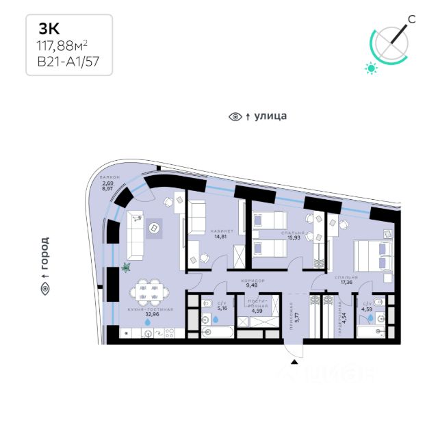 В продаже — двухкомнатная квартира с чистовой отделкой, общей площадью 91,1 кв. м. Квартира расположена на третьем этаже тринадцатиэтажной секции корпуса класса Адвансд в новом районе СберСити, который строит Сбер. Дом находится на второй береговой линии Москвы-реки. Сочетание элегантной архитектуры от ведущего итальянского бюро и передовых технологий на всех уровнях — от квартиры до инфраструктуры района. Отделка фасадов корпуса класса Адвансд выполнена из природного камня, глазурованной плитки и алюминия. В квартирах предустановлена система "умный дом" — комплекс решений, объединяющий квартиру, дом и прилегающую территорию. Жильцы смогут регулировать климат и освещение голосом или со смартфона, а также управлять сценариями освещения по заданным параметрам. Проведены работы по улучшению шумоизоляции, установлены двухкамерные стеклопакеты с алюминиевым профилем и скрытыми створками. В санузлах — тёплый пол. В доме расположены: • уютное лобби, • лапомойка, • общественная терраса, • коворкинг для жителей, • собственная спортивная студия, • колясочная и велосипедная комната на первом этаже, • детская игровая комната, • подземный паркинг. СберСити — это новый жилой и деловой район на западе Москвы, в одном из самых экологически чистых и престижных мест столицы. Это первая в России и крупнейшая в мире инновационная городская среда, созданная по международным стандартам зелёного проектирования. Здесь внедряются решения в области энергоснабжения, вакуумного мусороудаления, тестирования зелёных технологий, а в дальнейшем — системы искусственного интеллекта для управления домами и городской инфраструктурой. Строительство проекта началось в 2021 году, заселение первых корпусов — с лета 2024-го. Общая площадь территории — 461 га, из них более 2,5 млн кв. м жилья и около 833 тыс. кв. м офисных пространств. Будет построено 7 школ, 13 детских садов и 2 поликлиники. В СберСити будут жить 65 тыс. человек и работать 70 тыс. Развитием территории занимается АО "Рублёво-Архангельское", входящее в группу Сбер. СберСити — место, где хочется жить, работать и растить детей. Переезжайте в СберСити!