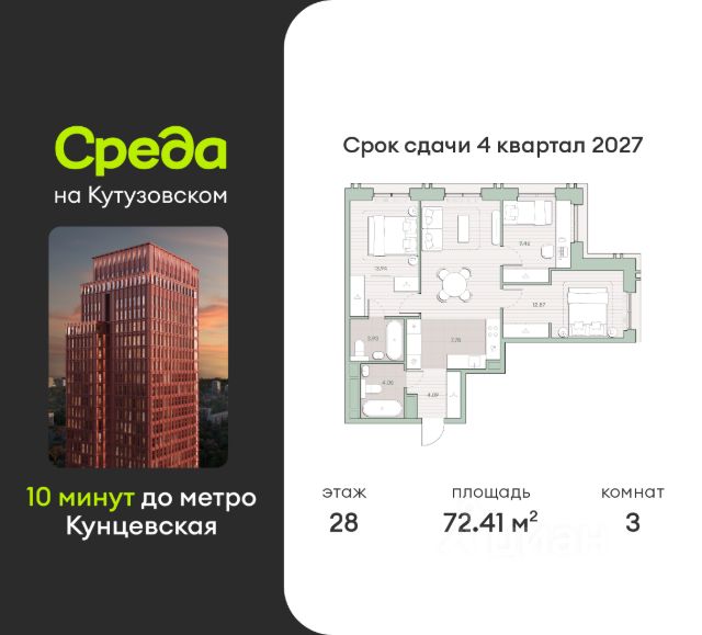 О квартире Продаётся 3-комнатная квартира общей площадью 83.71 кв.м. с отделкой white box. Квартира расположена на 12 этаже корпуса 4.1 в жилом комплексе бизнес-класса "Среда на Кутузовском" в пешей доступности от метро "Кунцевская". О жилом комплексе Комплекс предназначен для людей, которые ставят в приоритет свой комфорт, умеют прислушиваться к себе и понимают, что нужно для внутренней гармонии. Это проект для тех, кто ценит свое время и использует его правильно. Для тех, кто умеет радоваться тому, что есть. "Среда на Кутузовском" — личное место силы и гармонии в двух шагах от центра города. Инфраструктура Жилой комплекс строится в престижном и зеленом Кунцево. Здесь расположены различные торговые центры, престижные учебные заведения (МГУ, РЭУ им. Плеханова, Финансовый университет при Правительстве РФ, РУДН) медицинские клиники. Представлены широкие возможности для поклонников разных видов спорта: от бега в ближайших парках и велозаездов до гребли, баскетбола, футбола, хоккея, фигурного катания и катания на лыжах. На каждый день подойдет World Class с открытым бассейном — он находится всего в 1 минуте от дома. Выбор мест для прогулок также разнообразен: Суворовский парк, лесной массив Крылатских холмов, Москворецкий парк и природный заказник "Долина реки Сетунь". 10 мин пешком: -м. Кунцевская -вся необходимая инфраструктура До 15 мин на авто: -Северо-Западная хорда -Кутузовский проспект -Рублевское шоссе -МКАД -Можайское шоссе Особенности Проект сочетает в себе ритмичность и динамичность, благодаря своей архитектуре, при он этом окружен зеленью и парками. "Среда на Кутузовском" погружает в активный и разнообразный образ жизни, дает вариативные возможности досуга и вдохновляет на новые свершения. —Зоны отдыха у воды —Принцип многослойности в архитектуре —Зона барбекю —Пентхаусы —Умный паркинг —Гайдбук по управлению умным домом —Окна в пол на всех этажах