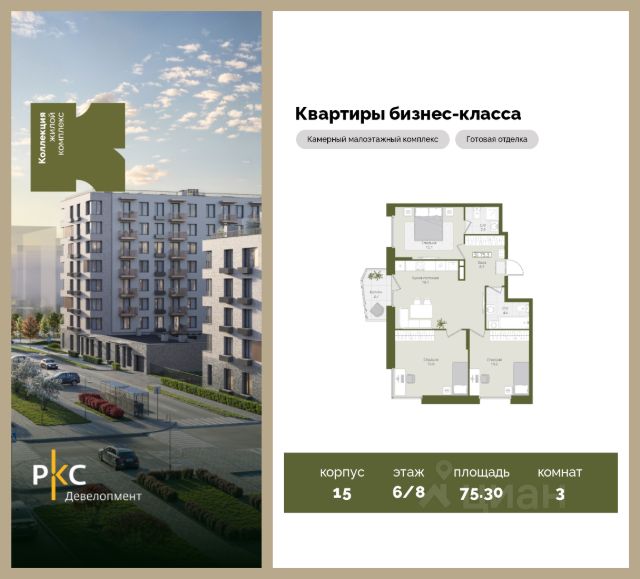 Агентам не звонить. Продается уютная 3-комнатная квартира на 6 этаже от застройщика. Общая площадь 75,3 кв.м. На выбор представлены 3 вида дизайнерской отделки с использованием качественных материалов. Высота потолков 3 м. Большая просторная кухня. "Коллекция" это камерный среднеэтажный жилой комплекс бизнес-класса в престижном экологически чистом районе Подмосковья. Прекрасная экология и живописная природа, отсутствие промышленных зон и вредных предприятий. В проекте планируется строительство 5 корпусов средней этажностью (4-8 этажей) с террасами и угловыми окнами, строительство собственной инфраструктуры: три детских сада, школа, поликлиника, физкультурно-оздоровительный комплекс. Жителям будут доступны машино-места в подземном паркинге, кладовые помещения. Ввод в эксплуатацию 3 кв. 2028г. Развитая инфраструктура: Детские площадки будут выполнены в природных материалах, игровые комплексы с бизибордами, развивающие игровые установки для игр с песком. Спортивная инфраструктура: столы для настольного тенниса, тренажеры, гимнастический комплекс. В пешей доступности находятся парк Дружба, загородный клуб "Moscow Country Club", парк имени Карбышева. Это располагает к приятным прогулкам и спокойному отдыху жителей комплекса. Транспортная доступность: 13 км от МКАД, 14 минут до МЦД-2 Нахабино, 26 минут до метро "Митино", 30 минут до метро "Пятницкое шоссе". В ближайшей перспективе - расширение местной дорожной сети и запуск новых маршрутов до ж/д станций и станций метро.