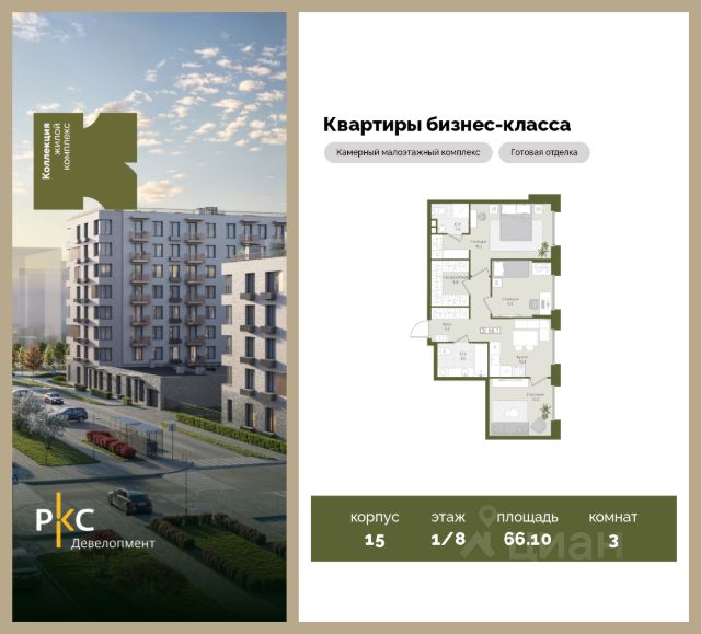 Агентам не звонить. Продается уютная 3-комнатная квартира на 1 этаже от застройщика. Общая площадь 66,1 кв.м. На выбор представлены 3 вида дизайнерской отделки с использованием качественных материалов. Высота потолков 3 м. Большая просторная кухня. "Коллекция" это камерный среднеэтажный жилой комплекс бизнес-класса в престижном экологически чистом районе Подмосковья. Прекрасная экология и живописная природа, отсутствие промышленных зон и вредных предприятий. В проекте планируется строительство 5 корпусов средней этажностью (4-8 этажей) с террасами и угловыми окнами, строительство собственной инфраструктуры: три детских сада, школа, поликлиника, физкультурно-оздоровительный комплекс. Жителям будут доступны машино-места в подземном паркинге, кладовые помещения. Ввод в эксплуатацию 3 кв. 2028г. Развитая инфраструктура: Детские площадки будут выполнены в природных материалах, игровые комплексы с бизибордами, развивающие игровые установки для игр с песком. Спортивная инфраструктура: столы для настольного тенниса, тренажеры, гимнастический комплекс. В пешей доступности находятся парк Дружба, загородный клуб "Moscow Country Club", парк имени Карбышева. Это располагает к приятным прогулкам и спокойному отдыху жителей комплекса. Транспортная доступность: 13 км от МКАД, 14 минут до МЦД-2 Нахабино, 26 минут до метро "Митино", 30 минут до метро "Пятницкое шоссе". В ближайшей перспективе - расширение местной дорожной сети и запуск новых маршрутов до ж/д станций и станций метро.