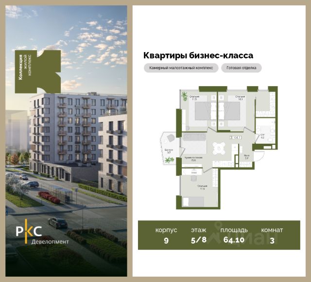 Агентам не звонить. Продается просторная 3-комнатная квартира на 5 этаже с готовой отделкой от застройщика. В квартире будет 3 спальни ,1 санузел, балкон, вид на дорогу/парковку/парк. Угловая планировка. Общая площадь 64,1 кв.м. На выбор представлены 3 вида дизайнерской отделки с использованием качественных материалов. Высота потолков 3 м. Площадь кухни 15.9 м2. "Коллекция" это камерный среднеэтажный жилой комплекс бизнес-класса в престижном экологически чистом районе Подмосковья. Прекрасная экология и живописная природа, отсутствие промышленных зон и вредных предприятий. В проекте планируется строительство 5 корпусов средней этажностью (4-8 этажей) с террасами и угловыми окнами, строительство собственной инфраструктуры: три детских сада, школа, поликлиника, физкультурно-оздоровительный комплекс. Жителям будут доступны машино-места в подземном паркинге, кладовые помещения. Ввод в эксплуатацию 3 кв. 2028г. Развитая инфраструктура: Детские площадки будут выполнены в природных материалах, игровые комплексы с бизибордами, развивающие игровые установки для игр с песком. Спортивная инфраструктура: столы для настольного тенниса, тренажеры, гимнастический комплекс. В пешей доступности находятся парк Дружба, загородный клуб "Moscow Country Club", парк имени Карбышева. Это располагает к приятным прогулкам и спокойному отдыху жителей комплекса. Транспортная доступность: 13 км от МКАД, 14 минут до МЦД-2 Нахабино, 26 минут до метро "Митино", 30 минут до метро "Пятницкое шоссе". В ближайшей перспективе - расширение местной дорожной сети и запуск новых маршрутов до ж/д станций и станций метро.