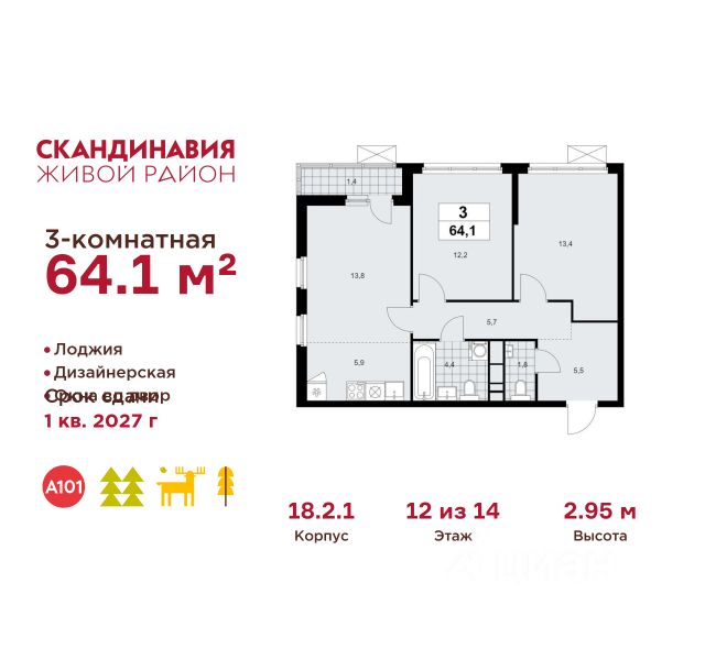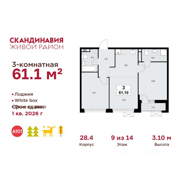 Продается трехкомнатная квартира 673 в новостройке Жилой район "Скандинавия" по адресу Москва, ТиНАО, Новомосковский АО, Сосенское С/П, Коммунарка пос., жилой комплекс Скандинавия, 28.4. Общая площадь квартиры - 61.10 кв. м., этаж 9 из 14, секция 8. Тип проекта, по которому построен дом - монолит, компания-застройщик - ООО "А101". Стоимость квартиры - 27372189 Р. ПРЕДЛОЖЕНИЯ ОТ ЗАСТРОЙЩИКА В ФЕВРАЛЕ 2026: Скидки до 10% на все квартиры. Только в офисах продаж до 28 февраля. Ипотека от 13,9 % для всех! На весь срок. "Семейная ипотека" вернулась. Ставка от 3,5 % на весь срок! Без удорожания! Выгодное ипотечное комбо: Ипотека от 2200 р./мес. и от 6 % после рождения ребёнка! Ипотека для всех "Держи пять!" - ставка 5 % на 2 года! *более подробную информацию по скидкам и акциям уточняйте в отделе продаж ЖК "Скандинавия" на границе Бутовского лесопарка (1610 га) - это баланс качественного жилья и сервисов, зелёных пространств для активного и созерцательного отдыха. Выразительная архитектура и цветовая гамма монолитных корпусов комфорт- и бизнес-класса (8-17 этажей) созвучны скандинавским мотивам, органично интегрированы в великолепный природный контекст. Огороженные дворы свободны от машин, в них продуманы места для отдыха и работы на свежем воздухе, озеленение, детские и спортивные площадки. Для прогулок, встреч и районных праздников - площадь Туве Янссон с "сухим" фонтаном, вековыми дубами и единственным в мире памятником писательнице; пешеходный променад 2 км; 3 крупных природных ручья; более 15 км велосипедных и прогулочных дорожек с арт-объектами. Инфраструктура района включает современные школы и детские сады, центр впечатлений, фитнес-клубы, развивающие и творческие центры, магазины, кафе, салоны красоты. На подземных этажах - паркинги и кладовые. Преимущества "Скандинавии": - ст. метро "Потапово" - 100 м от ближайших домов (открыта!) - удобные выезды на трассу Солнцево - Бутово - Варшавское шоссе и ул. Бачуринская - свои школы и детские сады - инфраструктура на первых этажах и рядом с домом - лесопарк, природные водоёмы, прогулочные маршруты