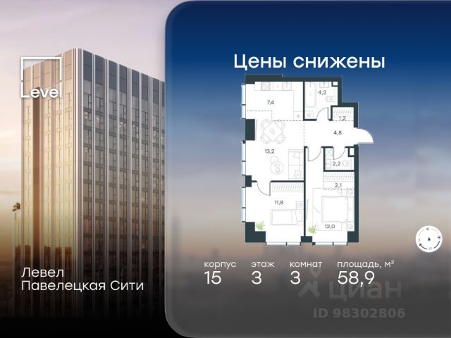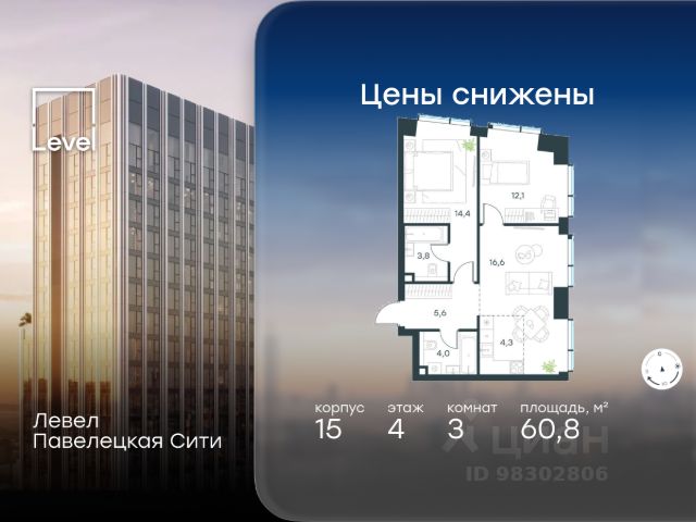 В Даниловском районе столицы (ЮАО) продаётся 3-комнатная квартира площадью 60.80 кв.м c предчистовой отделкой. Квартира расположена на 4 этаже 45-этажного корпуса 15 в жилом комплексе бизнес-класса Левел Павелецкая Сити. Высота потолков 3.00м.