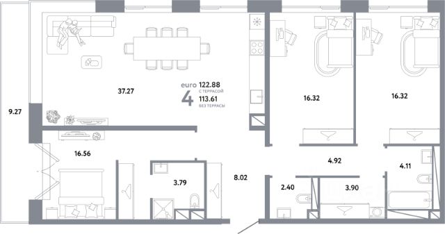Продаётся 3-комнатная квартира в строящемся доме (РЕДС 2), срок сдачи: I-кв. 2026, общей площадью 122.88 кв.м., на 8 этаже.
