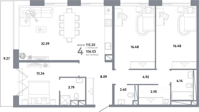 Продаётся 3-комнатная квартира в строящемся доме (РЕДС 2), срок сдачи: I-кв. 2026, общей площадью 115.3 кв.м., на 18 этаже.