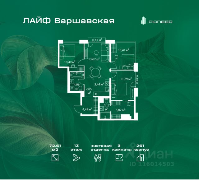 В районе Москворечье-Сабурово продается 3-комнатная квартира площадью 72.61 м². Она расположена на 13 этаже в 261 корпусе нового жилого квартала Лайф Варшавская. Площадь комнат: гостиная — 13,67 м² спальни — 11,29 м², 10,47 м², 10,49 м² кухня — 5,44 м² ванная — 4,06 м² В Лайф Варшавская мы создали идеальные условия для жизни молодых людей и семей с детьми, тинейджеров и спортсменов, домохозяек и бизнесменов. Жилой квартал Лайф Варшавская удачно расположен: 5 минут до станции "Варшавская" 10 минут до станции "Каширская" 18-25 минут до парка-усадьбы "Коломенское", Битцевского леса и музея-заповедника "Царицыно" Богатая инфраструктура — это визитная карточка проекта. На территории работают детский сад на 160 мест и школа на 900 мест с IT-полигоном и мультифункциональным спортивным стадионом. В квартале разместились пешеходный бульвар, игровой плейхаб "Змейка", спортивный кластер с полями для футбола и волейбола, площадка для выгула животных. На первых этажах жилых домов открыты магазины, кафе и рестораны, салоны красоты, арт-галереи, сервисы бытовых услуг, медицинские центры. Концепция жилого квартала создана ведущими архитектурными бюро. Структуры малоэтажных кварталов дополняются высотными башнями-доминантами. Такой тип застройки позволил сформировать освещенную приватную территорию. Продам 3-комнатную квартиру в новостройке с отделкой рядом с метро Варшавская.