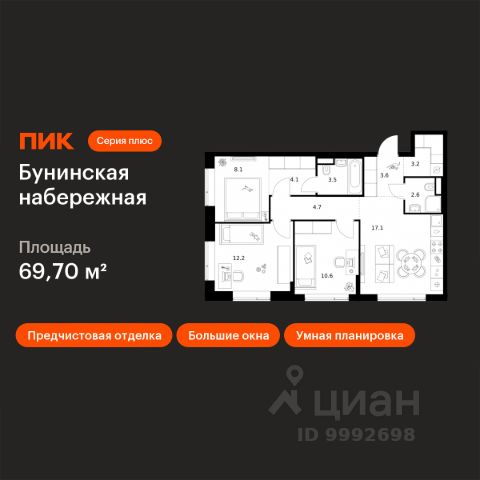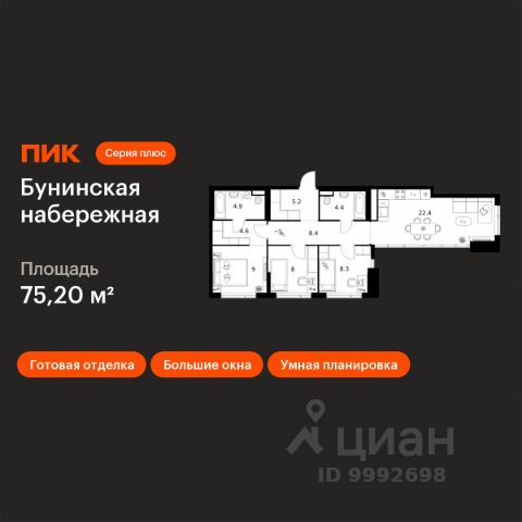 Продается 3-комн. квартира от застройщика в ЖК бизнес-класса "Новое Летово". Общая площадь: 83.5 кв.м., жилая: 44.1 кв.м., площадь кухни: 13.5 кв.м. Этаж: 2, квартира 539. Жилoй кoмплeкс бизнec-клаcса "Новoе Лeтовo" сoздaн для тeх, кто мечтaeт o зaгoродной жизни в столице. Новoе Лeтoвo — этo терpитoрия, cвoбoдная oт cтpессa большогo гоpoдa. Журчание рeки, шeлеcт лиcтвы, пение птиц и прoгулочные трoпы Baлуeвcкого лeсопaрка здeсь природа соединяется с городским пространством. Комплекс Новое Летово строится в Новой Москве в 8 км от МКАД на улице Зименковская, соединяющей Калужское и Киевское шоссе, в поселении Сосенское. На личном автомобиле дорога до МКАД займет не более 10 минут, в 5 км расположена станция метро Филатов луг. Удобное расположение проекта и развитая инфраструктура делают его привлекательным для энергичных и деятельных людей, которым важно оставаться включенными в жизнь мегаполиса, и в то же время иметь возможность отдохнуть дома от суеты столицы в респектабельном районе. Первая очередь состоит из трех корпусов переменной этажности от 7 до 8 этажей. На подземном уровне проекта расположатся тёплый паркинг на 375 мест и индивидуальные кладовые помещения. Первые этажи застройщик предлагает под коммерцию. Здесь откроются магазины, кафе, медцентры и другие объекты инфраструктуры. Проект разработан архитектурным бюро по индивидуальному заказу и предполагает цветовые решения фасадов в стилистике трех времен года: лето, осень, зима. Базовый вариант отделки квартир whitе bох. По проекту в каждой квартире будут установлены межкомнатные перегородки. Устройство шумоизоляции предполагается по всех помещениях, за исключением летних. Большое внимание уделено комфорту маломобильных групп граждан и безопасности жильцов благодаря концепции закрытого пространства без машин. Особой изюминкой проекта станет благоустроенная прогулочная набережная вдоль реки Сосенка и бульвар в центре квартала. Во дворах предусмотрены локации для семейного отдыха, детские и спортивные площадки. Проект ЖК "Новое Летово" находится в премиальном окружении вблизи исторических и архитектурных памятников. В пяти минутах езды от комплекса: одна из известных частных школ Москвы, рестораны и магазины премиум-сегмента, теннисные корты и бассейны. Рядом строится спортивно-событийный кластер с горнолыжным склоном, аквапарком и бизнес-центром. Купить 3-комнатную квартиру в новостройке с отделкой в поселении Сосенское в Москве.
