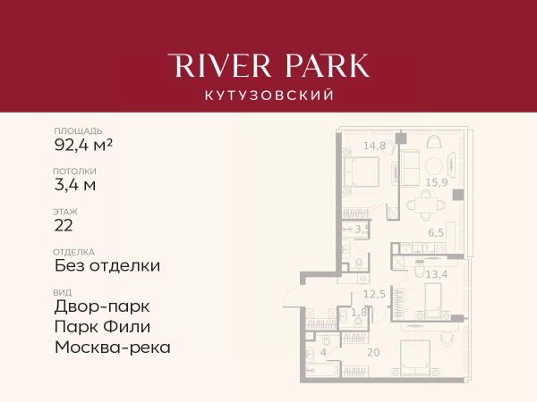 Продается 3-к квартира площадью 97.6 кв.м. на 9-м этаже в жилом комплексе премиум-класса River Park Кутузовский в Башне Amber Tower О жилом комплексе. Премиальный жилой комплекс River Park Кутузовский строится в одном из самых престижных районов столицы Дорогомилово, на берегу Москвы-реки. Яркий проект в стиле эко-футуризма станет самым масштабным и самым высотным ЖК в локации Кутузовского проспекта. В проекте будет впервые воплощена концепция Family Premium. Расположение и Транспортная доступность: - На берегу Москвы-реки, напротив Москва-Сити - 600 метров до Кутузовского проспекта - Удобный съезд с ТТК - Прямой выезд на МКАД по Северному дублеру Кутузовского проспекта. - В пешей доступности 3 станции метро: Фили, Парк Победы, Кутузовская, а также станция МЦД Фили. Архитектура от именитого бюро ADM отличается уникальной пластикой фасадов - башни словно парят в воздухе, играя гранями как драгоценные камни. Жилой комплекс состоит из 5-ти небоскребов с home park на закрытой территории и внешней торговой галереей с открытым доступом. В закрытом внутреннем дворе уникальная по насыщенности клубная инфраструктура - 5 Towers Club только для жителей: - Многофункциональная спортивная площадка (баскетбол, футбол, воллейбол, большой теннис) - Детский игровой клуб NEMO - Life Rooms с караоке, барной стойкой и meeting room - Music salon - Gedonist Club с бильярдной - Beauty station - Гольф-симулятор Впервые в Москве lounge зоны на крыше небоскребов, только для жителей: - Всесезонные беседки иглу - Джакузи - Барная стойка - Грили - Площадка для занятий йогой - Самые высоки качели на крыше в России - Видовые площадки Благоустройство комплекса занимает 3 гектара и разработано мировым экспертом по городским парковым ландшафтам - голландским бюро WEST8. Концепция проекта дать жителям отдохнуть от городского ритма, расслабиться среди природы и натуральных материалов. В home park будут высажены многолетние деревья по принципу no allergy. - Зеркальный пруд с арт-объектом - Две детские площадки - Work out с навесом - Цветущий сад - Party lounge - Видовая зона отдыха с очагом - Солярий На территории жилого комплекса планируется строительство крупного образовательного центра: детский сад на 200 мест и школа на 460 мест.