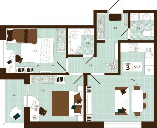 Продаётся 3-комнатная квартира в строящемся доме (Дом 20), срок сдачи: IV-кв. 2025, общей площадью 65.7 кв.м., на 12 этаже. Расположение, транспортная доступность Новый жилой комплекс "Юго-Восточный" строится в Туле, в 3,5 км от центра города. Благодаря удачным транспортным развязкам, автолюбители смогут доехать до центральных кварталов примерно за 5 10 минут, составив наиболее быстрый и удобный маршрут с учетом загруженности дорог. Проблем с мобильностью не возникнет и у пассажиров общественного транспорта. Рядом с домом расположены остановки автобусов и маршрутных такси, которые быстро довезут до любого района города. Так, чтобы добраться до центра, следует дойти пешком до остановки "Медтехника", где останавливается маршрутное такси, доезжающее до центральных кварталов всего за 7 8 минут. Инфраструктура Район, где возводится новый жилой комплекс, активно застраивается, и сеть инфраструктуры сов временем будет расширяться. Но и сейчас все, что нужно для комфортной жизни в городе, находится недалеко от жилого комплекса. В шаговой доступности расположены продуктовые магазины: "Виктория", "Овощи-фрукты", Магазин рыбы и мяса птицы, магазин мяса и колбас "У Максима", супермаркеты "Дикси", "Пятерочка", "SPAR". Неподалеку находится гипермаркет "Линия", крупный торговый центр, в котором расположены отделения банков, гипермаркет "Глобус", салон оптики, мебельный магазин "Столплит", зоомагазин "Четыре лапы" и пр. В соседнем здании находится строительный гипермаркет "Леруа Мерлен", за ним крупный магазин товаров для спорта, туризма и активного отдыха "Декатлон".Недалеко от жилого комплекса открыты кафе и рестораны: кофейня "Bonape", пиццерия "Культура", кафе "Вкуснов", кафе быстрого обслуживания "Rapido", ресторан "У фонтана" и пр.В районе есть аптеки, поликлиники, диагностические центры. В шаговой доступности от жилого комплекса расположено несколько детских садиков, в том числе, садик комбинированного вида "Алые паруса". Есть дошкольные отделения, входящие в состав образовательных центров, Центры развития ребенка. Поблизости расположены средние школы, в том числе, школа для детей с ОВЗ. Рядом с жилым комплексом находится Тульская Духовная Семинария и Суворовское училище. Надежность застройщик: достраивает объект ООО Ин-Групп.АрхитектураЖилой комплекс будет представлен 19 монолитно-кирпичными корпусами переменной этажности, выполненными в едином архитектурном стиле. При строительстве ЖК "Юго-Восточный" применяются современные материалы высокого качества, которые обеспечивают надежность домов и комфортный микроклимат в помещениях. Каждая секция оснащается современными лифтами. Помещения общего пользования отделываются экологичными материалами. Квартиры предлагаются однокомнатные (от 43,9 кв. м), двухкомнатные (от 45,8 кв. м), трехкомнатные (от 60,4 кв. м) и четырехкомнатные (от 87,2 кв. м), а также уютные студии (от 28,9 кв. м).На внутренней территории проводится комплексное благоустройство: озеленение, организация игровых площадок, мест для отдыха и за