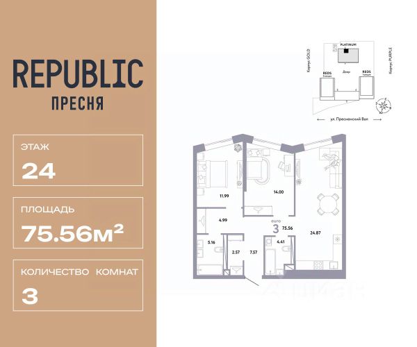 Новая квартира в ЖК "Republic" напрямую от федерального застройщика "Страна Девелопмент". Продается 3комнатная квартира на 11 этаже от застройщика Страна Девелопмент. Площадь квартиры 87,21 кв. м. Дизайн-квартал "Republic" — новый проект премиум-класса в Москве. 10 жилых башен и 4 восстановленных здания локомотивного депо образуют уникальное пространство. "Republic" — место, где вы ощутите гармонию истории и современности. Детский сад, SPA-комплекс с бассейном, гастрономический и шопинг-центры, собственный бульвар и яркие арт-пространства — для жителей предусмотрены все элементы премиального комфорта. Преимущества Уникальная жизненная среда, где инфраструктура включает гастрономию, SPA-комплекс с термами, образовательные и развлекательные заведения, арт-пространство и шопинг-аллеи. Двор от британского бюро "Gillespies": на 4 гектарах закрытого двора расположится 7 игровых зон для разных возрастов с ручьем и сухим фонтаном, арт-галерея под открытым небом и большой прогулочный бульвар. Лобби с террасой в башнях "Reds" — лаконичное пространство галереи-лобби, где можно проводить деловые и дружеские встречи, не нарушая приватности квартиры. В тёплое время года не остаётся пустующей терраса на крыше, которая привлекает непринуждённой атмосферой и прохладительными напитками в баре. Клубная гостиная — стильное пространство оборудовано кухней и залом для торжеств на 40 человек, а для того, чтобы побыть наедине с собой, почитать книгу или провести онлайн-встречу в гостиной оборудована мастерская с библиотекой. Уникальные форматы квартир, где можно реализовать любой жизненный сценарий: от стильного офиса в двухэтажной квартире до угловых лотов с просторными гостиными. А эксклюзивные пентхаусы с высокими потолками и панорамными окнами дарят захватывающие виды на Москву.. Отделка Квартиры сдаются без отделки или в формате White box. При отделке White box уже были выполнены все шумные и грязные работы руками наших специалистов: произведена разводка электричества с установкой подрозетников, установлены откосы из гипсокартона, устроена стяжка пола с шумоизоляцией. Способы покупки Сотрудники "Страна Девелопмент" будут сопровождать вас на каждом этапе сделки, помогут получить одобрение по ипотеке или снизить ежемесячный платеж. - ипотека - рассрочка - с использованием материнского капитала - 100% оплата наличными