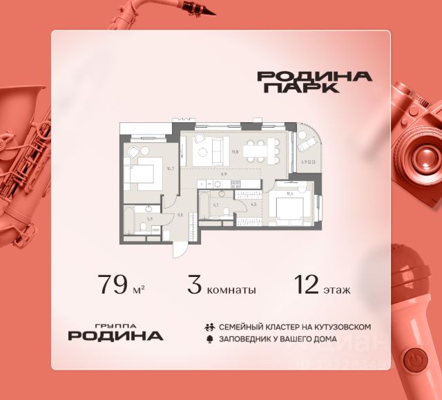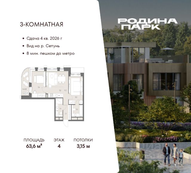 В жилом кластере Родина Парк рядом с природным заказником Долина реки Сетунь продаётся 3-комнатная квартира. Продуманная европланировка, которую легко зонировать под ваши запросы. Потолки от 3,1 м. "Родина Парк" — премиальный семейный кластер с образовательным медиакластером, строящийся на западе Москвы в окружении природного заповедника "Долина реки Сетуни". • Скидки недели на избранный пул лотов • Рассрочка 0% на выгодных условиях до 2 лет • Семейная ипотека, подбор комбо-вариантов ипотечных программ прямо в офисе продаж • Скидки 8% при 100% оплате или ипотеке. ЛОКАЦИЯ: 8 минут пешком до станции БКЛ "Давыдково". 12 минут на автомобиле до Нового Арбата. Удобные выезды на Кутузовский проспект, Аминьевское шоссе. ИНФРАСТРУКТУРА И СЕРВИСЫ ДЛЯ ЖИТЕЛЕЙ - Уникальная экосистема для развития, здоровья и творчества на территории 3,5 Га: - Первый в России образовательный медиакластер (с участием Русской медиагруппы) для творческого развития детей и взрослых с возможностью получить востребованную профессию в сфере шоу-бизнеса. - Инфраструктура и сервисы для семей с детьми на территории жилого кластера (частный детский сад, детские игровые пространства, творческие студии для занятий музыкой и танцами, безопасная и комфортная среда для детей и родителей), событийно-культурная площадка для проведения семейного досуга); - Здоровая среда (биохакинг-центр, фитнес-зал и спортивная инфраструктура во дворе, медитационные пространства, инженерные решения для освещения, свежего воздуха и очистки воды, сервисы красоты и поддержания активного долголетия); - Сервисы заботы (инфраструктура комфорта - подземный паркинг, кладовые, колясочные, консьерж- сервис, умный дом, мобильное приложение, профессиональная управляющая компания, сервисы охраны и обеспечение абсолютной безопасности) - Комьюнити резидентов (социальные пространства для дружеского и делового общения - летний атриум с уличным кинотеатром, зоны отдыха, кафе и рестораны, комьюнити-сервис с культурно- событийной программой в медиакластере); - Модуль благосостояния (комфортные пространства для работы и саморазвития - коворкинги и переговорные). ИНФРАСТРУКТУРА РАЙОНА: Насыщенная образовательная среда: филиалы МГИМО, МГУ, МГТУ, Сколково. Топовые школы: 6 лучших частных школ Москвы и области (Forbes) в 10 минутах езды. Природное окружение для пеших прогулок, спорта и отдыха. "Родина Парк" — это место, где растут и дети, и ваши возможности. Экосистема, где всё подчинено развитию — физически, профессионально, творчески.