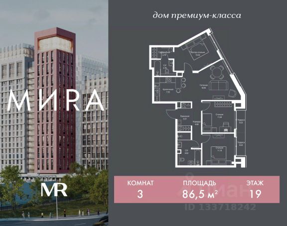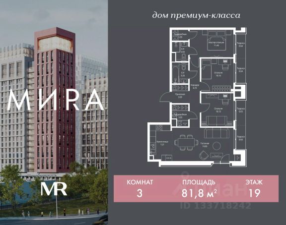 Прямая продажа от застройщика. Продаётся 3-комнатная квартира общей площадью 83.11 м² без отделки в доме премиум-класса МИRА на 3-м этаже 17 этажного дома. Квартира расположена в корпусе 1. Дом премиум-класса МИRA это: • Спокойный район с богатой историей и сложившейся инфраструктурой • Авторская архитектура на стыке классики и современности • Вход в парк прямо из жилого комплекса • Панорамные виды на Яузу, парки, ВДНХ и скульптуру "Рабочий и колхозница" • Удобные сервисы и безопасность для каждого резидента Расположение: Жилой квартал расположен в Алексеевском районе на северо-востоке Москвы, на второй линии домов, таким образом вы сможете дистанцироваться от шума и суеты проспекта Мира, но при этом будете жить недалеко от этой важной городской магистрали. Прямо у дома: • Парк Акведук • Река Яуза • Памятник "Рабочий и колхозница" Пешком: • 16 мин м. ВДНХ На автомобиле: • 12 мин ТТК • 15 мин Садовое кольцо • 12 мин Национальный парк "Лосиный остров" Благоустройство: Концепция благоустройства от бюро "ДРУЖБА" разработана в стиле "Лесная тропа". В уютном дворе расположились словно затерянные в лесу, площадки для отдыха. Они разделяются островками с травами, кустарниками, крупными камнями и деревьями, между которыми проходят узкие песчаные тропинки с деликатной подсветкой по вечерам. Центральной точкой притяжения для жителей станет главная площадь с фонтаном, которая открывается сразу из двух входных групп. Внутренний двор МИRA: • Детская площадка с зонами для игр малышей до трех лет и детей более старшего возраста • Спортивная площадка с профессиональным оборудованием для тренировок • Декоративные перголы • Воздушный арт-объект с подсветкой, похожий на облако • Чайный домик, где в отдельном отапливаемом павильоне можно в любое время года попить кофе с соседями или устроить камерное семейное чаепитие • Зоны для работы и отдыха с гамаком под навесом, скамейками и креслами Инфраструктура и окружение: В Алексеевском районе есть огромные благоустроенные парки, магазины, гимназии с высоким рейтингом и филиалы ВУЗов, частные и государственные детские сады, модные кофейни и фитнес-центры. В квартале МИRА предусмотрены: • 2 ресторана с видом на парк Акведук • 3 кафе • фитнес-студия • подземный паркинг на 330 машино-мест Компания MR предлагает своим клиентам специальные условия приобретения квартир в рамках программ ипотечного кредитования от банков-партнеров. 3-комнатная квартира от застройщика в районе Алексеевский в Москве.