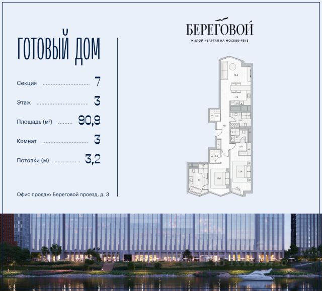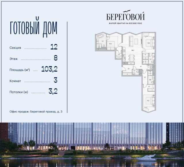 Река. Парк. Сити. Готовый дом в идеальном месте. Продается 3-комнатная квартира на 5 этаже с панорамным остеклением и видом на Береговой пр-д. Береговой — квартал-курорт в центре столицы. Готовый дом на первой линии Москвы-реки. Пешеходная набережная начинается прямо от дома — никаких дорог между вами и рекой. Уникальное сочетание природы парка Фили и ритма Сити. Ключи от нового образа жизни в Береговом: • 12 террас на крышах — ваши виды на Москву с высоты птичьего полета • Пешеходная набережная прямо у дома — ни одной машины между вами и рекой • Лобби с камином, переговорной и консьерж-сервисом • Флагманский Encore Fitness — самый большой в сети (4700 м²) с бассейном, термами и спа-комплексом • Детство на берегу Москвы-реки — в рамках проекта будут построены две школы и детский сад рядом с домом • Гастрономическая набережная: рестораны и премиум-сервисы откроются на первых этажах • Причал "Береговой" рядом с домом — путешествуйте по городу, пока другие стоят в пробках • Безопасность и уединение: контроль доступа на территорию, видеонаблюдение и круглосуточная диспетчерская • Двухуровневый подземный паркинг и кладовые Безупречная квартира для жизни: • Пространство света и воздуха: панорамные окна и высокие потолки 3.2 м • Технологии: центральное кондиционирование и роботизированная система очистки фасадов — вид из окна всегда будет идеальным • Совершенство планировки: просторная кухня-гостиная, минимум коридоров, максимум полезной площади • Квартира без отделки — возможность раскрыть преимущества планировки в вашем уникальном интерьере. Или выбирайте свою версию идеального дома в коллекции планировок: • С изолированными спальнями • Мастер-спальнями с гардеробными и ванными • Видовые ванные комнаты • Функциональные постирочные Эксклюзивные лоты: • Пентахусы с приватными террасами • Двухуровневые пентхаусы Локация, о которой мечтают 15 минут до Сити на машине — и вы в эпицентре деловой жизни. Две станции метро в пешей доступности — когда каждая минута на счету. Утром — пробежка по парку Фили, вечером — прогулка на велосипеде вдоль реки, выходные — водный спорт в Крылатском. Речные трамвайчики вместо такси, зеленые парки и благоприятная экология — привилегии престижного ЗАО Москвы. Условия покупки: выгодные программы покупки от застройщика, специальные условия при полной оплате. Оставляйте заявку на персональную презентацию в шоу-руме. Продается 3-комнатная квартира от застройщика на проезде Береговой в Москве.