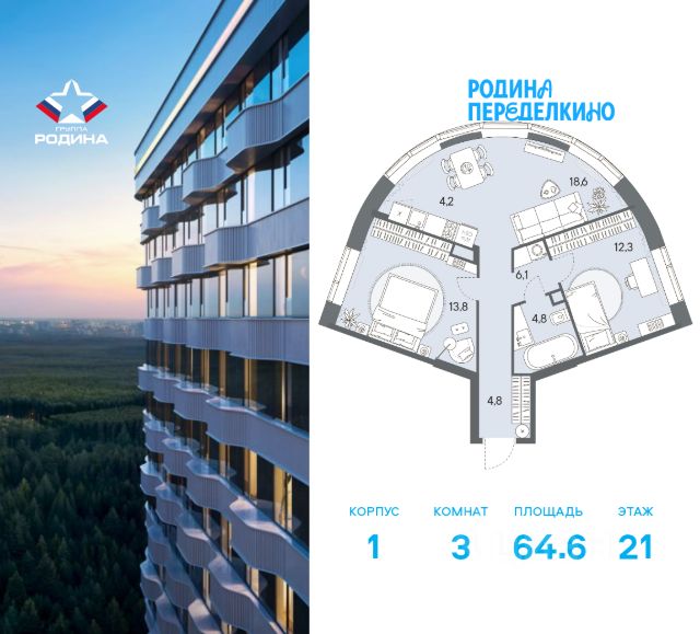 Продается 3-комнатная квартира общей площадью 60.9 кв. метров на 24 этаже жилого комплекса Лучи.
