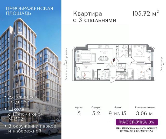 Рассрочка 0% от застройщика. Первоначальный взнос от 20%. Предложение действует до 31 января 2026 года Квартира на 2 этаже в жилом комплексе премиум-класса "Преображенская площадь". Общая площадь: 95.79 кв.м. Проект премиум-класса в историческом районе Москвы. До метро "Преображенская площадь" 3 минуты пешком. Квартиры сдаются без отделки и в свободной планировке, чтобы жители могли оформить пространство с учетом своей индивидуальности. Высота потолков от 3,15м, широкоформатное остекление, 3-5 квартир на этаже. Система Умный дом. Дизайнерские лобби. Внутренний двор 1,5 га функциональное и безопасное пространство для игр, работы и занятий спортом. Пешеходный променад для прогулок. Дома переменной этажности. Есть подземный паркинг. Жилой комлекс находится в окружении парков Сокольники, Черкизовский, Измайловский, заповедника Лосиный остров и ВДНХ, а также вблизи пешеходной набережной. Комфортная удаленность от центра: 7 минут на автомобиле до ТТК, 8 минут до Садового кольца, 25 минут до Кремля.
