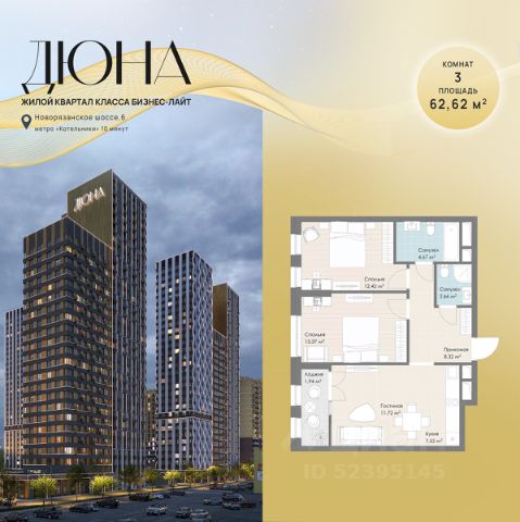 Продаётся 3-комнатная квартира в строящемся доме (Корпус 4), срок сдачи: II-кв. 2028, общей площадью 62.62 кв.м., на 10 этаже. Многоквартирный жилой комплекс с подземной автостоянкой и встроенно-пристроенным ДОУ на 120 мест по адресу: Московская область, г.о. Котельники, Новорязанское шоссе, вл. 6, комплекс 1