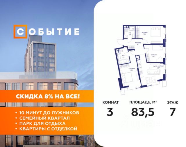 Последний день акции "Скидка 8%" Весь март - скидка до 8% действует до 31.03.2026 г. при 100% оплате и не субсидированной ипотеке! В продаже 3-к квартира от застройщика. Общая площадь 76.00, жилая 37.00, кухня 20.9. Квартира расположена на 7 этаже жилого квартала "Событие-6", корпус 2, Секция 4. Квартира без отделки. Срок сдачи: 4 кв. 2029 года. СОБЫТИЕ.6 — финальный дом парк-квартала СОБЫТИЕ на Мосфильмовской. Переезжайте в уже сформированный квартал с готовой инфраструктурой и парком! Премиальный жилой комплекс в престижном районе Москвы предлагает стильную архитектуру, продуманное благоустройство и великолепно разнообразие общественных пространств. Свой парк прямо возле дома! Архитектура Архитектура СОБЫТИЯ.6 выполнена в ультрасовременном стиле московским бюро Atrium на основе дизайн-кода британских архитекторов LDA Design и UHA London. Дом отличает оригинальная геометрия фасадов, большое остекление и высокие лобби (до 6,2 м) с авторской мебелью и светильниками. Расположение Мосфильмовская улица (Раменки) — один из престижных районов Москвы. Близость к историческому и деловому центру, природным зонам Запада столицы. Транспортная доступность: • 10 мин до Москва-Сити и ТТК; • 15 мин до Садового кольца; • 25 мин до аэропорта Внуково; • 7-10 мин до станций метро "Аминьевская" и "Мичуринский проспект". Инфраструктура: • парк "Событие" (12 га, финалист конкурса Правительства Москвы) с беговыми (1,5 км) и велодорожками (2,7 км), экотропой (1,6 км), площадками, лекторием; • школа, детский сад, магазины, салоны красоты, рестораны (к моменту заселения); • мультидвор с игровыми и спортивными площадками, мини-бульваром; • общественная терраса на 10-м этаже (коворкинг, лаунж); • Закрытые общественные пространства: детская комната, спортивный зал, коворкинг, лаунж-зоны. Паркинг 256 мест для жителей (48 — для электромобилей), 24 гостевых (5 — для электромобилей), мойки колес, кладовые, зоны для велосипедов. Окружение Парки и заповедники (Воробьёвы горы, Матвеевский лес и др.), МГУ, театр им. Н. И. Сац, стадион "Лужники". Безопасность Видеонаблюдение, контроль доступа, видеодомофоны, консьерж-сервис 24/7, системы пожарной безопасности и мультисервисная оптическая сеть.