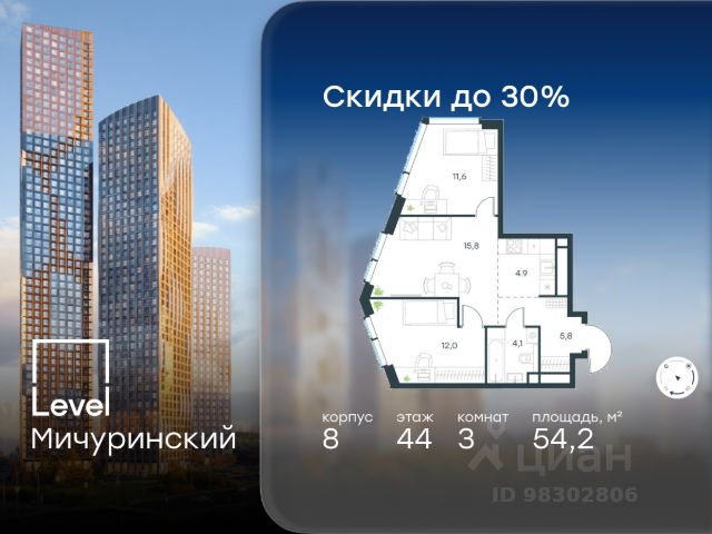 Цена указана с учётом скидки при 100%-й оплате, несубсидированной ипотеке, рассрочке (кроме программы "Рассрочка 0%"). В жилом квартале, расположенном на границе с природным заказником "Долина реки Очаковки", продаётся 3-комнатная квартира площадью 56.00 кв.м без отделки. Квартира расположена на 37 этаже 48-этажного корпуса 8 в жилом комплексе бизнес-класса Level Мичуринский (компания Level Group/Левел групп). Отличная транспортная доступность: - от 10 мин. пешком до станции метро "Мичуринский проспект" - 15 мин. пешком до станции метро "Аминьевская" - 7 мин. на авто до МКАД - 10 мин. на авто до ТТК - 15 мин. на авто до Москва-Сити Продуманный архитектурный проект: - Выразительная архитектура от известных бюро: корпуса 1-6 - СПИЧ, корпуса 7-13 - Borisov Architects; - Из окон открываются живописные виды на парки, Москва-Сити и МГУ; - Высокие потолки до 6,35 м; - Стильные лобби с окнами в пол и высокими потолками до 4,7 м; - С каждого этажа дома на лифте можно спуститься в подземный отапливаемый паркинг. Расположение: Level Мичуринский строится в одном из самых зелёных районов Москвы - Очаково-Матвеевское. Этот уголок столицы идеален для поддержания здорового образа жизни. В шаговой доступности от проекта находятся заказник "Долина реки Очаковки" - 1 мин. пешком и Очаковский парк - 7 мин. пешком. На велосипеде можно добраться до таких парков, как "Событие", парк Олимпийской деревни, парк 50-летия Октября и парк Школьников. В 15 минутах езды на авто расположено более 30 детских садов (из них 14 в пешей доступности), 32 школы (из них 13 в пешей доступности) и 14 вузов. Также в ближайшем окружении - более 25 медицинских учреждений, 11 спортивных клубов и 22 продуктовых супермаркета. Внутренняя инфраструктура: На территории жилого комплекса строится три детских сада и школа. На первых этажах домов откроется супермаркет, фитнес-центр, ресторан, кафе и другие сервисы. Подземные этажи займут паркинги: трёхуровневые - в этапах 1 и 2, одноуровневый - в этапах 3 и 4. Преимущества проекта: - 4,5 га благоустроенной территории с видовым мостом, уличным кинотеатром, зонами для тихого отдыха, работы, воркаута, площадки для петанка, футбола, настольного тенниса и пляжного волейбола. - Дизайнерские лобби с панорамным видом на двор, мойками для лап животных и комфортными зонами ожидания. - Безопасность жителей: круглосуточное видеонаблюдение всех зон общего пользования (лобби, лифты, паркинги, детские площадки), система контроля доступа, управление видеодомофоном через мобильное приложение, единый ключ доступа на территорию жилого комплекса. - Технологии и комфорт: высокоскоростной Wi-Fi в лобби и на придомовой территории, автоматическая система контроля и учёта ресурсов, абонентская связь с консьержем, распознавание номеров автомобилей при въезде в паркинг и выезде из него.