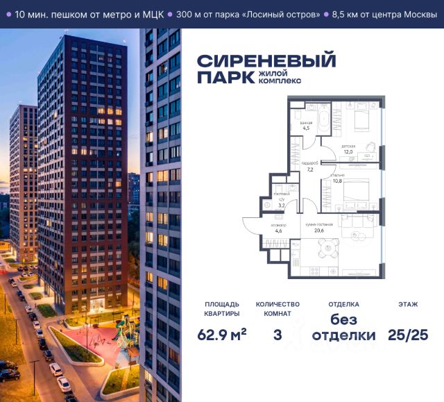Продаётся просторная 3-комнатная квартира общей площадью 61.5 м² на 8 этаже в новом жилом комплексе "Сиреневый парк", расположенном в Восточном административном округе Москвы на улице Тагильская. Всего 10 минут ходьбы от станции метро "Бульвар Рокоссовского" и одноимённой платформы МЦК. Высококачественное монолитное строительство гарантирует сохранение тепла в доме, а наличие квартир с предчистовой и чистовой отделкой позволяет вам сэкономить время и сразу же переехать в свое жилье после покупки. Благодаря разнообразию планировок вы сможете выбрать идеальный вариант, соответствующий вашим предпочтениям и образу жизни. Предлагаются квартиры: - с просторными кухнями-гостиными, - с нишами для хранения вещей и отдельными гардеробными, - мастер-спальни с собственными санузлами, - большие комнаты с высокими потолками (2,9 м) и с увеличенными безопасными окнами (1,95 м) , которые наполнят ваш дом естественным светом; - с чистовой отделкой по двум дизайн-проектам на выбор; - с остекленными лоджиями и панорамными видами на лес. Каждая деталь в этом доме создана для вашего комфорта: - безбарьерная среда, - бесшумные скоростные лифты, - машиноместа в отапливаемом подземном паркинге и кладовые на -1 этаже с доступом из лифта, - развитая инфраструктура с супермаркетами, кафе, фитнес-клубами, салонами красоты и частным детским садом обеспечивает максимальное удобство жителям. В 300 метрах от ЖК расположен Национальный парк "Лосиный остров". Способы покупки: 100%, Trade-in, Семейная ипотека без наценки, стандартная ипотека. Запишитесь на просмотр в офис продаж и получите свою персональную скидку по акции Назови свою скидку. ЖК "Сиреневый парк" — гармония в деталях, совершенство в каждом моменте. Застройщик проекта - AFI Development.