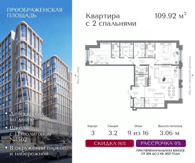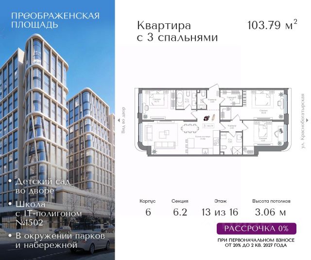 Рассрочка 0% от застройщика. Первоначальный взнос от 20%. Предложение действует до 31 января 2026 года Квартира на 3 этаже в жилом комплексе премиум-класса "Преображенская площадь". Общая площадь: 74.1 кв.м. Проект премиум-класса в историческом районе Москвы. До метро "Преображенская площадь" 3 минуты пешком. Квартиры сдаются без отделки и в свободной планировке, чтобы жители могли оформить пространство с учетом своей индивидуальности. Высота потолков от 3,15м, широкоформатное остекление, 3-5 квартир на этаже. Система Умный дом. Дизайнерские лобби. Внутренний двор 1,5 га функциональное и безопасное пространство для игр, работы и занятий спортом. Пешеходный променад для прогулок. Дома переменной этажности. Есть подземный паркинг. Жилой комлекс находится в окружении парков Сокольники, Черкизовский, Измайловский, заповедника Лосиный остров и ВДНХ, а также вблизи пешеходной набережной. Комфортная удаленность от центра: 7 минут на автомобиле до ТТК, 8 минут до Садового кольца, 25 минут до Кремля.