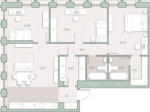Старт продаж новой очереди! Продаётся 3-комнатная квартира общей площадью 85.16 м² без отделки в ЖК VEER на 18-м этаже 70 этажного дома. VEER.2 — вторая очередь футуристичного квартала бизнес-класса VEER. Это новая экосистема в престижном Западном округе Москвы, поражающая масштабностью внутренней инфраструктуры. ЖК находится всего в 5 минутах от Кутузовского проспекта и в 15 минутах от Сколково. Ансамбль из четырех стеклянных башен с доминантой в 237 метров разработан по принципу современного урбанизма и выражен в лаконичных объемах — параллелепипедах со сглаженными углами, которые придают зданиям утонченный вид. Расположение и транспортная доступность: • Образовательный комплекс в составе топовой школы, состоящий из двух зданий: основное на 1500 школьных и 450 дошкольных мест, отдельное здание детского сада на 300 мест. • Парк "Долина реки Сетунь" площадью более 700 гектаров • Рядом МГУ, МГИМО, РАНХиГС и Академия ФСБ • 15 минут по Кутузовскому проспекту до ужина в центре с видом на Москву-реку • 18 минут пешком до м. "Давыдково" • Открытие новых станций метро в шаговой доступности в будущем Инфраструктура: Двор в VEER.2 — это ассиметричные холмы, каменные "лабиринты", зеленые ковры и хвойные островки с единой живой экосистемой. Здесь есть все: • Павильон умиротворения Место отдыха под навесом в спокойной части двора, окруженное деревьями. • Активная тропа Тактильная дорога из камней разного диаметра для расслабляющих прогулок. • Бизнес-гарден Оборудованное пространство для работы на свежем воздухе со столом и встроенными розетками. • Детская площадка Двухуровневая площадка "Ботаника" с песочницей, переговорной трубой и горкой "Дружба". Компания MR предлагает своим клиентам специальные условия приобретения квартир в рамках программ ипотечного кредитования от банков-партнеров.
