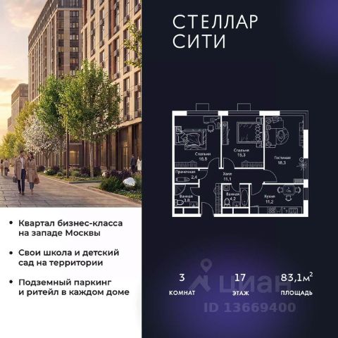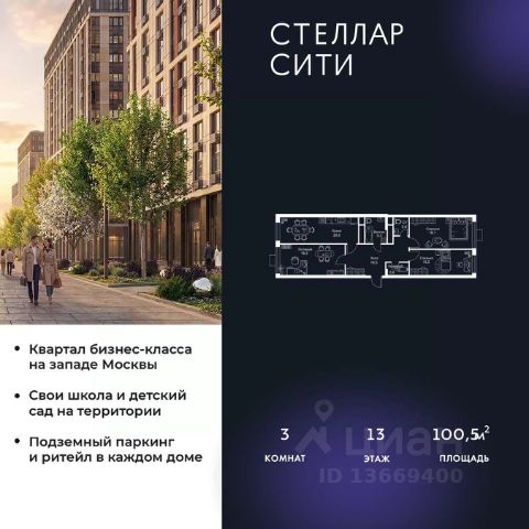 Продается квартира от надежного застройщика Tashir Estate в квартале бизнес-класса Stellar City в ЗАО Москвы. Площадь квартиры составляет: 71.7 кв. м, потолки: 3.1 м Квартира находится на 4 этаже, 4 корпуса жилого квартала Stellar City — микрогорода будущего на орбите Москвы. Stellar City — квартал в ЗАО Москвы вблизи инновационного центра Сколково. В окружении — 11 парков и природных зон, в том числе Долина реки Сетунь, Мещерский лес и парк развлечений The Rink. Город в городе Чтобы дом и инфраструктура вокруг отвечала динамичному лайфстайлу жителя мегаполиса, в основу проекта легла концепция город в городе, которая позволяет решать все бытовые вопросы in-home. В квартале будут возведены школа и детский сад, воркаут-зоны, променад, вело и беговые дорожки, детские площадки для каждого корпуса, а также коммерция на первых этажах для ежедневных покупок. Все необходимое — на расстоянии нескольких шагов. Изящные и лаконичные лобби Авторский дизайн, натуральные материалы в отделке и безупречный интерьер вне времени. Лобби и холлы в проекте бизнес-класса Stellar City ничем не отличаются от входных групп в премиум-сегменте благодаря качественным европейским материалам в отделке, стильному дизайну, консьерж-сервису и уютной зоне ожидания с журнальными столиками и мягкой мебелью. Комфорт и безопасность Закрытая территория, охрана, система СКУД, специально разработанное мобильное приложение дома для резидентов и подземный паркинг с круглосуточным наблюдением и доступом с помощью автоматического считывания номера авто.