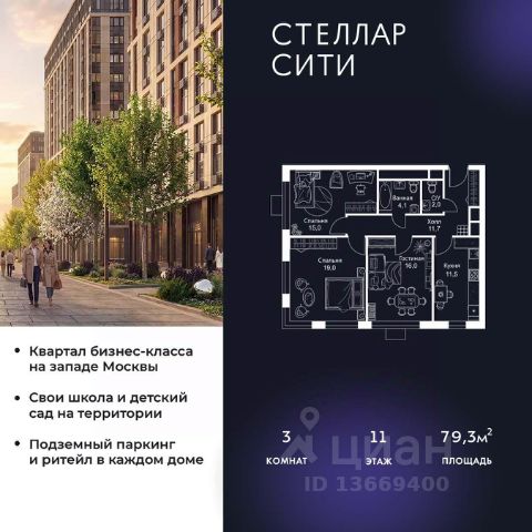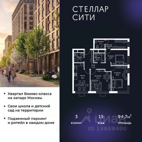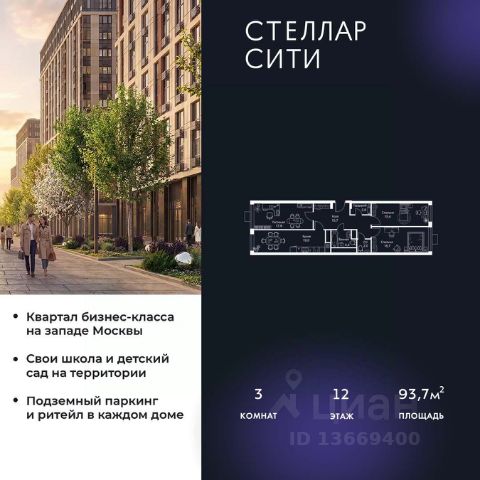 Продается квартира от надежного застройщика Tashir Estate в квартале бизнес-класса Stellar City в ЗАО Москвы. Площадь квартиры составляет: 71.7 кв. м, потолки: 3.1 м Квартира находится на 4 этаже, 4 корпуса жилого квартала Stellar City — микрогорода будущего на орбите Москвы. Stellar City — квартал в ЗАО Москвы вблизи инновационного центра Сколково. В окружении — 11 парков и природных зон, в том числе Долина реки Сетунь, Мещерский лес и парк развлечений The Rink. Город в городе Чтобы дом и инфраструктура вокруг отвечала динамичному лайфстайлу жителя мегаполиса, в основу проекта легла концепция город в городе, которая позволяет решать все бытовые вопросы in-home. В квартале будут возведены школа и детский сад, воркаут-зоны, променад, вело и беговые дорожки, детские площадки для каждого корпуса, а также коммерция на первых этажах для ежедневных покупок. Все необходимое — на расстоянии нескольких шагов. Изящные и лаконичные лобби Авторский дизайн, натуральные материалы в отделке и безупречный интерьер вне времени. Лобби и холлы в проекте бизнес-класса Stellar City ничем не отличаются от входных групп в премиум-сегменте благодаря качественным европейским материалам в отделке, стильному дизайну, консьерж-сервису и уютной зоне ожидания с журнальными столиками и мягкой мебелью. Комфорт и безопасность Закрытая территория, охрана, система СКУД, специально разработанное мобильное приложение дома для резидентов и подземный паркинг с круглосуточным наблюдением и доступом с помощью автоматического считывания номера авто.