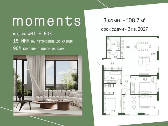 Цены указаны с условием 100% оплаты и стандартной ипотеки. Продается 3-к. квартира номер 488 общей площадью 80.3 кв.м. на 10-м этаже 40 этажного дома, корпус 2.3. С отделкой White Box. Moments — ЖК бизнес-класса, расположен на расстоянии вытянутой руки от старинного усадебного парка Покровское-Стрешнево. Moments — это единение города и природы, дом, который помогает обрести гармонию и баланс в жизни. Moments расположен на Волоколамском шоссе с удобным выездом в центр и в область, а также с расположенными в пешей доступности объектами транспортной инфраструктуры (МЦК и МЦД-2). Жилой комплекс будет состоять из 3 очередей — 8 корпусов высотой от 4 до 47 этажей. Здания будут расположены под разными углами для максимальной открытости солнцу и максимально роскошным видовым характеристикам. Внутренний двор: Иммерсивное благоустройство от британского бюро Gillespies и West8 сфокусировано на эмоциональном и чувственном опыте. Каждая прогулка по Moments погружает в путешествие со сменой сценариев и плавным потоком уникальных моментов. - Пешеходная экотропа,которая соединяет комплекс с парком Покровское-Стрешнево - Двор с фонтаном - Зеленые сады и лаунж-зоны - Пространства для пикников и общения - Зоны активного отдыха. Детские и спортивные площадки - Пешеходные тропы и велодорожки - Разнообразная коммерческая инфраструктура - Детский сад на 175 мест - Школа на 300 мест - Игровые площадки из натуральных материалов - Сенсорные сады - Безбарьерное зонирование