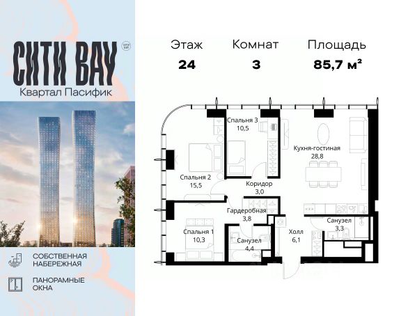 Продаётся 3-комнатная квартира 74 м². В жилом районе Алиа на 26-м этаже 28-этажного дома. Жилой район Алиа — это дома бизнес-класса у слияния Москвы-реки и Сходни. Алиа находится в Покровском-Стрешневе, экологически чистом районе на престижном северо-западе столицы. Район возводится на бывшей территории Тушинского аэрополя, где никогда не было промышленного производства. Алиа — это район разностороннего развития, спроектированный по принципу WORK.LIVE.PLAY.LEARN. Это "15-минутный город", где вся необходимая для комфортной жизни инфраструктура — на расстоянии приятной прогулки. У района удобное расположение: отсюда меньше 10 минут пешком до станций метро "Спартак" и "Тушинская" и всего полчаса на автомобиле до центра города или аэропорта Шереметьево. Архитектурную концепцию Алиа разработало бюро SOM (Skidmore, Owings & Merrill), авторы знаменитой "Бурдж-Халифа". В Алиа больше 140 планировочных решений, среди которых — редкие для Москвы форматы: квартиры с окном в ванной, пентхаус, сити-юниты и таунхаусы. Почти половина территории района отдана под благоустройство. В Алиа три парка: Линейный парк с кафе и магазинами, Центральный парк с амфитеатром, сухим фонтаном и большим плейхабом для детей всех возрастов и Прибрежный парк на собственной набережной, одной из самых длинных в Москве. В каждом урбан-блоке — закрытый внутренний двор с гипоаллергенными растениями и детской площадкой. В лобби каждого жилого корпуса в Алиа оборудована зона ожидания, колясочная, гостевой санузел и лапомойка для домашних животных. За стойкой ресепшена резидентов и их гостей встречает консьерж. Центральное лобби урбан-блока — это стильное общественное пространство с коворкингом, лаундж-зоной и кофе-пойнтом. Это "вторая гостиная" жителей урбан-блока и одно из мест, где формируется комьюнити Алиа. Два ключевых объекта инфраструктуры в Алиа — это спорткомплекс "Чкалов Арена", где представлены 25 видов спорта, и самый большой в стране бизнес-парк класса A, благодаря которому району обеспечено быстрое развитие.