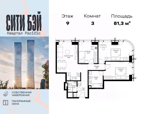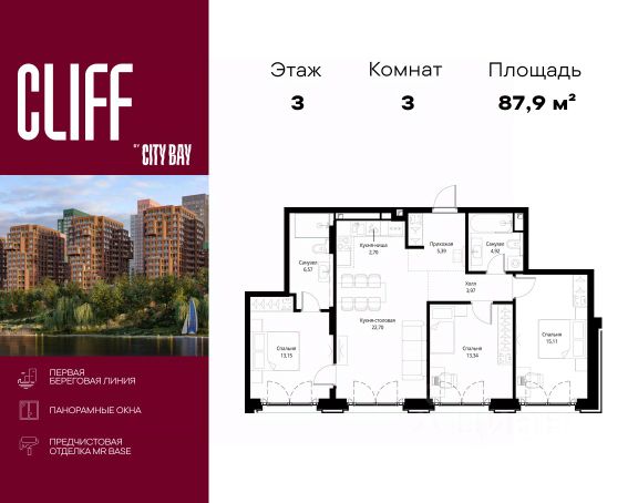 Прямая продажа от застройщика. Продаётся 3-комнатная квартира общей площадью 90.50 м² без отделки в ЖК Сити Бэй, квартале Pacific, на 12-м этаже 59 этажного дома. Концепция жилого комплекса Сити Бэй - настоящий город в городе с отлично развитой инфраструктурой и собственной благоустроенной набережной. На территории жилого комплекса расположено пять кварталов - Atlantic, Pacific, Indian, North, Cliff. Жилой квартал Сити Бэй отличается оригинальной концепцией и выделяется среди других проектов такими характеристиками как: - Архитектура, - Виды из окон, - Природное окружение, вызывая гордость у жителей и восхищение у прохожих. Вся жизнь района Покровское-Стрешнево строится вокруг водных объектов: - Пойма реки Сходни с уникальной экосистемой, - Речка Химка и Химкинское водохранилище, - Москва-река, - Канал имени Москвы. Кругом вода, и местные с удовольствием этим пользуются. А сразу за рекой - центр водного спорта в Строгино с вейк-парком и яхт-клубами. Помимо воды, здесь очень много зелени: - Рядом Сходненский ковш памятник природы, естественный амфитеатр глубиной 40 метров; - Парк при усадьбе Братцево с фруктовым садом; - Дубовая роща "Маяк", - Алешкинский лес; - Лесопарк Покровское-Стрешнево с пляжами и бобрами. Главные транспортные артерии района: - Волоколамское шоссе, - Таганско-Краснопресненская линия метро и МЦД-2. Всего за 20 минут можно добраться до центра на машине или метро, а МЦД связывает ЖК Сити Бэй с северными, восточными и юго-восточными районами. Компания MR предлагает своим клиентам специальные условия приобретения квартир в рамках программ ипотечного кредитования от банков-партнеров.
