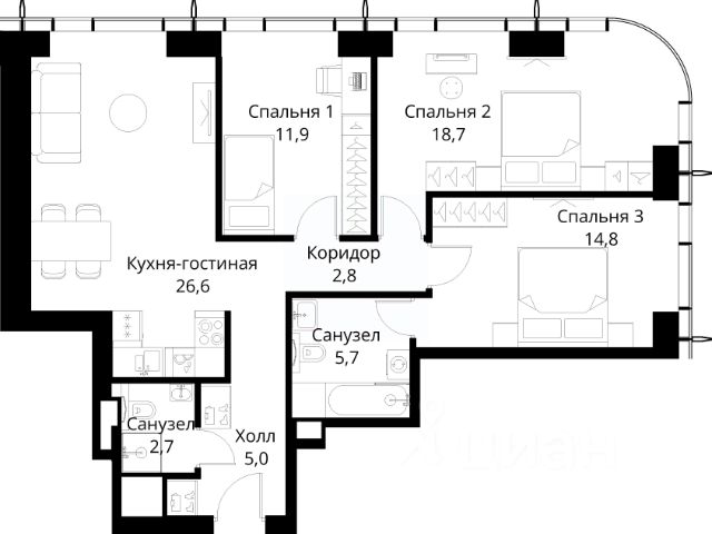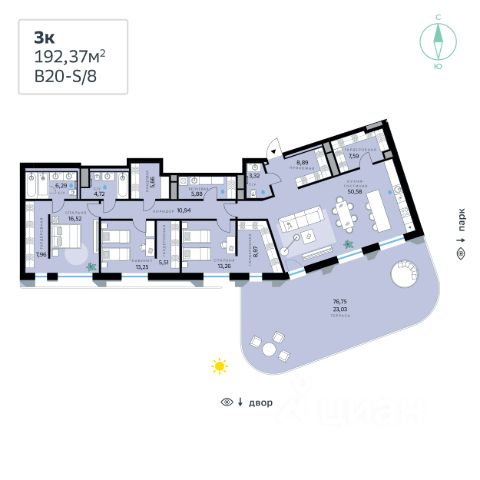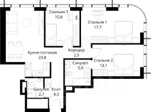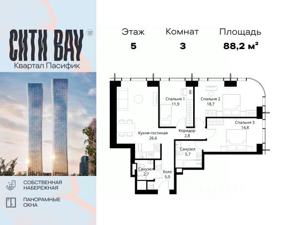В продаже — двухкомнатная квартира, общей площадью 79,26 кв. м. Квартира расположена на первом этаже семиэтажного корпуса Балансд в квартале В16 нового района СберСити, который строит Сбер. Архитектуру квартала В16 создало итальянское бюро ARCHEA middle east: каждый дом узнаваем, но вместе они складываются в спокойный, цельный ансамбль. В облицовке сочетаются тёплые оттенки кирпича и металла, за счёт игры фактур фасады выглядят живыми и меняются в разное время дня. Строгая геометрия поддерживает ритм города, а мягкая природная палитра помогает чувствовать себя дома, а не в деловом квартале. Дом возводится по технологии монолитного строительства. Квартиры передаются без отделки, что позволяет будущим владельцам реализовать собственные дизайнерские решения и индивидуальные планировки. В квартирах предустановлена система "умный дом", объединяющая управление квартирой, домом и прилегающей территорией. Можно регулировать климат и освещение голосом или через смартфон. Квартал состоит из девяти домов средней этажности — от 7 до 10 этажей. Корпуса формируют большой внутренний двор площадью два гектара. Во дворе предусмотрены зоны для разных сценариев: просторные площадки для детей, пространства для активного досуга и спорта, тихие места для отдыха и спокойного времени, а также удобные рабочие места под открытым небом. Здесь легко найти своё — для жизни, здоровья и занятий тем, что действительно нравится. В доме предусмотрены: уютное лобби с зоной ожидания, лапомойка, санузел, помещение для хранения колясок и велосипедов, подземный паркинг. СберСити — это новый жилой и деловой район на западе Москвы, в одном из самых экологически чистых и престижных мест столицы. Это первая в России и крупнейшая в мире инновационная городская среда, созданная по международным стандартам зелёного проектирования. Здесь внедряются решения в области энергоснабжения, вакуумного мусороудаления, тестирования зелёных технологий, а в дальнейшем — системы искусственного интеллекта для управления домами и городской инфраструктурой. Строительство проекта началось в 2021 году, заселение первых корпусов — с лета 2024-го. Общая площадь территории — 461 га, из них более 2,5 млн кв. м жилья и около 833 тыс. кв. м офисных пространств. Будет построено 7 школ, 13 детских садов и 2 поликлиники. В СберСити будут жить 65 тыс. человек и работать 70 тыс. Развитием территории занимается АО "Рублёво-Архангельское", входящее в группу Сбер. СберСити — место, где хочется жить, работать и растить детей. Переезжайте в СберСити!