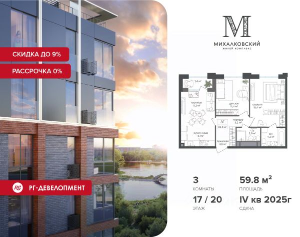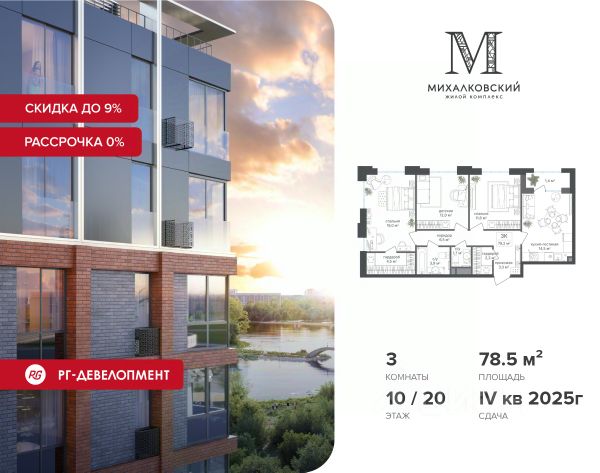 При приобретении квартиры доступна беспроцентная рассрочка с первым платежом от 30%. У покупателя также есть право воспользоваться скидкой в размере 7% от полной стоимости квартиры. Условия программы рассрочки: - Скидка 7% - Первый платеж — от 30% от стоимости объекта. - Оставшаяся сумма выплачивается не позднее 31.05.2026. - Действует на приобретение квартир в корп. 4, 5 Продаётся 3-к квартира 78,2 кв.м. в ЖК "Михалковский" на 2-м этаже 20 этажного дома. Скидка 9% при покупке квартиры! Цена указана с учетом максимального размера скидки. Ипотека для каждого! Полная стоимость кредита от 12,380% до 18,537%. Ставка от 0,11% в АО "Альфа-Банк", ген. лицензия ЦБ РФ 1326 от 16.01.2015. Ставка фиксируется на первые 12 месяцев, далее полная стоимость кредита от 22,022% до 24,599% ставка 21,59%. Первоначальный взнос — от 20,1% от стоимости квартиры. Срок кредитования — от 4 до 30 лет. Компания "РГ-Девелопмент" предоставляет скидку на квартиры в жилом комплексе. Акция действительна до 31.03.2026 включительно. Чтобы воспользоваться предложением, необходимо подписать договор на приобретение недвижимости до 31.03.2026 включительно. Действует программа "Растет семья - растет и квартира". Компания "РГ-Девелопмент" вошла в ТОП-10 девелоперов по объёму введённого жилья в "Старой Москве" по итогам 2025 года. Прямая продажа от застройщика! Квартиры без отделки. Срок сдачи 1 кв. 2026 г., корпус сдан Особенности проекта: Завораживающие виды Красивое благоустройство Уникальная локация для Москвы (рядом Головинский парк, пруды, усадьба Михалково) Рядом с центром В проекте присутствует: архитектура голландского бюро MLA+, зеленые зоны, транспортная доступность, благоустроенная территория, подземный паркинг, детский сад и выход на Головинский парк с пятью прудами. Название комплекса указывает на одну из его черт - соседство с имением Михалково. Позвольте себе жить в месте, где проводили свой досуг династии Дашковых и Паниных.