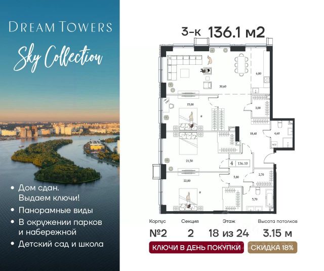 Увеличенный объем панорамного остекления создает неповторимое ощущения воздушности пространства! Двор-набережная с видами на гладь реки и кроны деревьев. Премиальный квартал DREAM RIVA — авторская архитектура в курортной концепции, воплощающей силу природных стихий в каждой детали оформления и благоустройства. Продаётся Квартира с 2 спальнями квартира на 21 этаже 26-этажного дома (3 корпус). Общая площадь: 79.7 кв.м. Высота потолков от 3 м. Формат приватного досуга и эксклюзивные привилегии в DREAM RIVA с приоритетным доступом для резидентов: - Первая линия Москвы-реки с открытыми видами на воду и город; - 3 Га приватного прибрежного парка с зонами для спорта и йоги; - Открытый солярий; - Школа и собственный детский сад; - Многофункциональные детские игровые площадки и детское кафе с игровой комнатой; - Клубная гостиная и lounge-бар. Локация вне конкуренции — инфраструктура полуострова предлагает всё, что нужно для размеренной жизни, работы, отдыха и развлечений: - Благоустроенная набережная с гастрогалереей; - Парк аттракционов Остров Мечты (в торговой части: рестораны, кафе, супермаркет, магазины, салон красоты, йога-студия и многое другое); - 44 Га ландшафтных парков для прогулок, спорта, пикников; - Пляжный комплекс Dream Beach Club со множеством бассейнов, ресторанов, баров и развлечений для любого возраста; - Яхт-клуб; - Вейк-парк; - Кинотеатр под открытым небом и многое другое. Удобная транспортная доступность: - Центр рядом: 15 минут до Садового кольца на авто, 20 минут до Сити или Кремля; - В 5 минутах прогулочным шагом — станция метро "Технопарк"; - Южный речной вокзал. Наши менеджеры будут рады провести для Вас консультацию и подробнее рассказать о проекте. Успейте купить на лучших условиях! Продается 3-комнатная квартира от застройщика в районе Нагатинский затон в Москве.