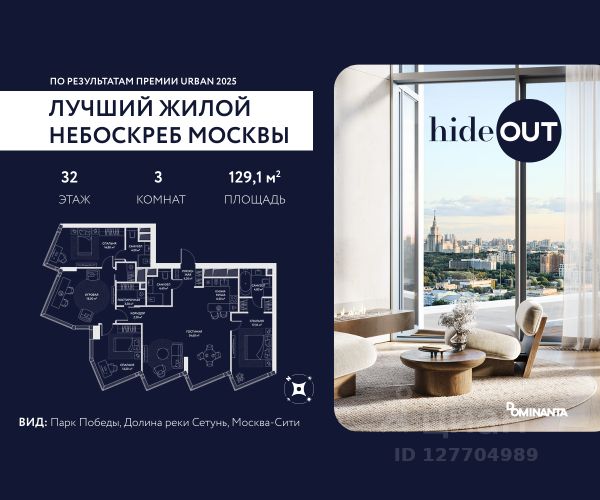 Прямая продажа от застройщика. Продается 3-комнатная квартира площадью 117,2 кв.м. на 27-м этаже 34-этажного дома в ЖК hideOUT с панорамными видами: Парк Победы, Долина реки Сетунь МГУ, Москва-Сити, Воробьевы горы. Высота потолков 3,25 м. hideOUT — премиальный проект компании Dominanta. Это новый уровень жизни и комфорта без компромиссов. Две башни — 34 и 49 этажей — открывают захватывающие виды на Москву. Архитектурной доминантой проекта становится мост, соединяющий башни на высоте 80 метров. Закрытая территория, охрана 24/7, зона экстренной безопасности на подземном уровне, система пожаротушения. На мосту между башнями на 22-м этаже находится SocialHUB — предусмотрено 16 комфортных пространств для работы, отдыха и развлечений с панорамными видами и клубным форматом доступа. Концепция благоустройства hideOUT — баланс между природой и технологичным городом будущего. На территории сада предусмотрены 15 зон для отдыха, работы, спорта и детей. Знаковым местом станет центральная площадь с амфитеатром и водопадом — сочетание камней, растений и струящейся воды создает идеальный баланс с природой. В проекте действуют привлекательные условия покупки: - скидка до 20% при 100% оплате стоимости лота и ипотеке без субсидирования. Предложение действует до 28.02.2026. - рассрочка 0% на 12 месяцев с первоначальным взносом 30% / на 18 месяцев с первоначальным взносом 50%. Застройщик АО "СЗ "ХАЙДАУТ", ИНН 7729058636, ОГРН 1027739319420. Проектная декларация на сайте наш.дом.рф. Предложение не является публичной офертой.