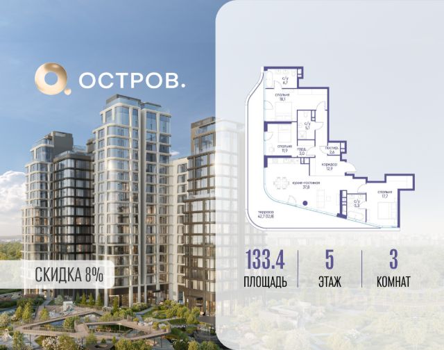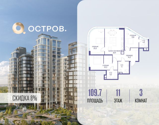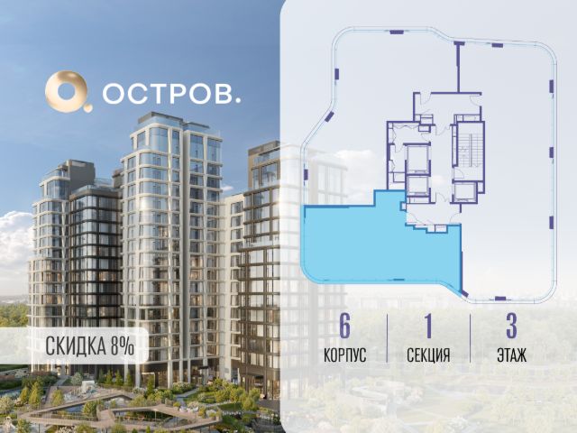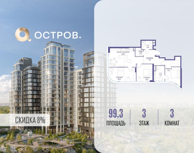 Скидка до 8% действует до 31.03.2026 г. при 100% оплате и не субсидированной ипотеке. Продаётся 3-комн. квартира от застройщика: общая площадь 99.30 м², жилая 46.90 м², кухня 25.80 м², 3-й этаж, жилой квартал "Остров 12", корпус 6 (секция 1). Срок сдачи: 1 квартал 2029 года. 2 совмещенных санузла. В жилой зоне 2 больших окна на одну сторону, хорошая инсоляция. Позвоните сейчас и забронируйте квартиру! ОСТРОВ от Донстрой - жилой комплекс на западе Москвы, в Мневниковской пойме. Уникальное преимущество комплекса - в том, что он обособлен от города рекой и природным парком (650 га). Благодаря природному окружению эта территория имеет лучший экологический рейтинг в столице. Кварталы ОСТРОВА объединены ландшафтным дизайном в единое пространство - с набережными и Центральным бульваром. На ОСТРОВЕ любые объекты, необходимые для полноценной жизни и отдыха, находятся на расстоянии 15-минутной прогулки. Торговый центр и супермаркеты, кафе и рестораны, фитнес, салоны красоты, школы и детские сады. А также крупнейший в Москве спортивный кластер.