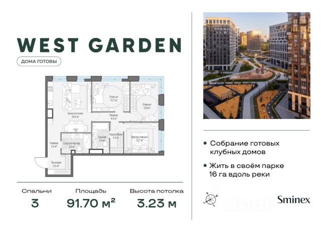 Комфортная и продуманная до мелочей 3-спальная квартира площадью 95.80 кв. м на 9 этаже в клубном доме 8. Увеличенная площадь окон и высота потолков 3.23 м дарят впечатляющие виды на парки, зеленые зоны и природные заказники. West Garden - это собрание клубных домов высотой 12-14 этажей в собственном парке 16 гектаров вдоль реки. Просторный среднеэтажный квартал расположен на Минской улице, в респектабельном Западном округе столицы. Вокруг премиальное окружение и более 1000 гектаров парков. West Garden - это возможность обеспечить себе и своей семье лучшие условия для жизни в одном из самых привлекательных и зелёных районов столицы. Гармония природы дополнена здесь впечатляющими возможностями и привилегиями: • Расположение в зелёном Западном районе столицы вблизи центра и ключевых магистралей в окружении парковых зон (заказник "Долина реки Сетунь", Мосфильмовский пруд, Ботанический сад МГУ, природный заказник "Воробьёвы Горы", Парк Победы на Поклонной горе) • Современная лаконичная архитектура, у каждого дома свой индивидуальный облик и выразительный фасад с использованием натуральных и долговечных материалов (гранит, известняк, клинкерный кирпич) • Функциональные лобби с отделкой из дерева и натурального камня с высокими потолками до 7,8 м • Самый большой собственный парк для прогулок и отдыха: 8 га собственной закрытой и благоустроенной территории, а также 8 га прилегающего парка на набережной с зонами отдыха с шезлонгами, маршрутами для бега, пеших и велосипедных прогулок • Инфраструктурный центр Clubhouse только для жителей: клубная гостиная с террасой и творческой атмосферой по фирменному стандарту Friend`s Lab, детская игровая зона 300 кв. м по стандарту Kid`s Lab • Насыщенная и разнообразная инфраструктура для детей любого возраста: 8 развивающих детских площадок в парке, 3 детские площадки на благоустроенной набережной, площадка для отдыха и досуга подростков • Спортивная инфраструктура по стандарту Fit Lab: многофункциональные площадки для футбола, баскетбола, волейбола с трибуной для болельщиков, зона воркаута, теннисные столы, зона для йоги, беговая дорожка 3 километра, фитнес-центр только для жителей • Комфортный и просторный подземный паркинг на 1313 машино-мест, 482 келлера, автомойка только для жителей на четыре поста