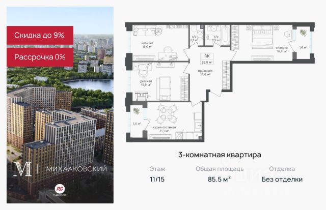 Ипотека для каждого! Полная стоимость кредита от 11,578% до 22,490%. Ставка от 0,11% в АО "Альфа-Банк" фиксируется на 1 год с даты заключения кредитного договора, далее полная стоимость кредита от 25,819% до 28,767% ставка 25,39% до окончания срока кредитования. Первоначальный взнос — от 20% от стоимости квартиры. Срок кредитования — от 3 до 30 лет. Скидка 9% при покупке квартиры! Цена указана с учетом максимального размера скидки. Продаётся 3-к квартира 63,0 кв.м. в ЖК "Михалковский" на 7-м этаже 9 этажного дома. Компания "РГ-Девелопмент" предоставляет скидки на квартиры в жилом комплексе. Акция действительна с 12.09.2024 г. до 15.10.25г. включительно. Чтобы воспользоваться предложением, необходимо подписать договор на приобретение недвижимости до 15.10.25г., включительно. Действует программа "Растет семья - растет и квартира". Прямая продажа от застройщика! Старт продаж новых корпусов. Квартиры без отделки. Срок сдачи 1 кв. 2026 г. Особенности проекта: Завораживающие виды Красивое благоустройство Уникальная локация для Москвы (рядом Головинский парк, пруды, усадьба Михалково) Рядом с центром В проекте присутствует: архитектура голландского бюро MLA+, зеленые зоны, транспортная доступность, благоустроенная территория, подземный паркинг, детский сад и выход на Головинский парк с пятью прудами. Название комплекса указывает на одну из его черт - соседство с имением Михалково. Позвольте себе жить в месте, где проводили свой досуг династии Дашковых и Паниных. 3-комнатная квартира от застройщика в округе САО в Москве.