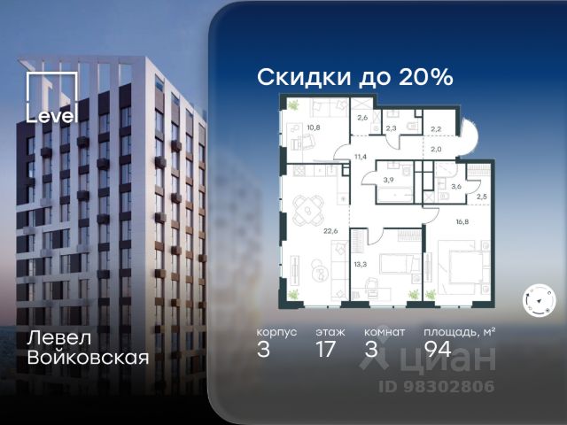 Цена указана с учётом скидки при 100%-й оплате, несубсидированной ипотеке, рассрочке (кроме программы "Рассрочка 0%"). Продается 3-комнатная квартира площадью 91.80 кв. м без отделки. Квартира находится на 8 этаже 20-этажного корпуса 3, в новом жилом комплексе бизнес-класса Левел Войковская, расположенном рядом с живописным заповедником "Покровское-Стрешнево" (застройщик - компания Level Group/Левел групп). Прекрасная транспортная доступность - 7 мин. пешком до станции МЦК "Балтийская"; - 15 мин. пешком до станции метро "Войковская"; - 8 мин. на машине до ТТК; - 15 мин. на машине до центра Москвы; - 20 мин. на машине до Москва-Сити. Продуманный архитектурный проект - стильная архитектура от мастерской Фефелова В. В.; - панорамные виды на парки, Химкинское водохранилище и Останкинскую башню; - лобби с высотой потолков до 6,45 метров; - более 20 видов планировок, включая редкие форматы квартир с террасой и увеличенной высотой потолков до 5,42 метров; - 2 варианта дизайнерской отделки в корпусе 4 как дополнительная опция к отделке white box: стиль Modern в светлых холодных тонах и стиль Classic в нейтральной бежевой гамме. Квартиры в корпусах 3 и 5 сдаются без отделки. Расположение Жилой комплекс Левел Войковская строится в престижном Северном округе Москвы, где развитая инфраструктура и живописная природа переплетаются в единый ансамбль. Войковский район окружают парки и набережные. В шаговой доступности - парк "Покровское-Стрешнево", не более 15-ти минут на велосипеде занимает путь до Тимирязевского парка и 9-ти минут до парка усадьбы Михалково. Рядом более 60 школ, 75 дошкольных учреждений, 17 государственных и 6 частных вузов, 25 супермаркетов, 4 торговых центра, среди которых ТЦ "Метрополис" и ТЦ "Авиапарк". Внутренняя инфраструктура На территории жилого комплекса предусмотрены коммерческие помещения: кафе, ресторан, пекарня и другие сервисы на первых этажах корпусов. Для жителей будет доступен отапливаемый подземный паркинг на 244 машино-места с доступом с любого этажа на лифте. На территории паркинга будет расположено 125 кладовых помещений для хранения сезонного инвентаря. Лобби и благоустройство Дизайн лобби жилого комплекса Левел Войковская создан совместно с бюро BLANK. Теплая цветовая гамма, ресепшен, зоны ожидания, лапомойки и гостевые санузлы - каждая деталь превращает лобби в комфортное продолжение вашего дома. 1,15 га площади в первых двух этапах строительства отведено под приватный внутренний двор, который спроектирован совместно с бюро "Правда". Детские площадки для всех возрастов, спортивные пространства для йоги, воркаута и петанка, уютные зоны для тихого отдыха или работы. Здесь утро начинается с вдохновения, а вечер наполнен приятными моментами. Лифты Комфортное перемещение внутри жилого комплекса обеспечат надёжные лифты с доступом в паркинг с жилых этажей. В каждом корпусе предусмотрено по 3 грузопассажирских лифта. 3-комнатная квартира от застройщика в округе САО в Москве.