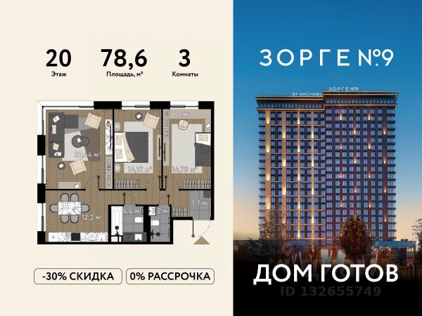 "Зорге 9" — готовые апартаменты бизнес-класса на Ходынке. 10 минут до Москва-Сити. Архитектура: 3 современных корпуса с фасадами в стиле архитектуры Нью-Йорка и с сервисами премиальных отелей, высотой до 23 этажа. Строгие линии, панорамные окна создают ощущение неподдельной роскоши и комфортной жизни в сердце мегаполиса. Проект награжден авторитетной премией European Property Awards. Резиденции: Свободная планировка, небольшая глубина этажа, огромные панорамные окна в пол до 3,6 м и высота потолков до от 3,3 до 4,3 м позволяют реализовать самые смелые концептуальные идеи и создать идеальный интерьер с учетом всех пожеланий. Вдохновляющие виды на город украсят ваш апартамент лучше любой картины. Есть возможность приобретения дизайн-проекта и полной меблировки апартаментов от партнеров девелопера. Расположение: 3 мин. пешком до парка Березовая роща 10 мин. пешком до Ходынского поля 10 мин. до ТЦ Авиапарк 30 минут до Шереметьево 10 мин до Москва-Сити или 1 станция до Москва-Сити 5 минут до ТТК 4 станции метро в шаговой доступности: 6 мин м. Полежаевская (фиолетовая ветка) 7 мин МЦК Зорге (МЦК) 7 мин м. Хорошевская (голубая ветка) 10 мин МЦК Хорошёво (МЦК) Благоустройство: Собственный парк 2 га с амфитеатром и поющими фонтанами. В парке высажено 136 деревьев и более 11 000 кустов и мелких растений из немецких питомников. Площадка для йоги и воркаут-зона со спортивными площадками. Теннисные столы и детский плейхаб Две башни Авторское гранд-лобби В лобби предусмотрена лаундж-зона, чайная с камином, комната для хранения велосипедов и колясок. Доступ по системе FACE ID. В отделке лобби и лифтовых холлов использован декоративный камень итальянского бренда Atlas Concorde Пентхаусы На верхнем уровне комплекса расположены роскошные просторные пентхаусы с высотой потолка до 4,2 метра и панорамными окнами до 3,6 метров, открывающими великолепные виды на столицу. Пентхаусы с выходами на собственные приватные террасы на кровле, площадью от 150 кв. м являются жильем high-уровня, демонстрирующим высокий статус владельца. 3-комнатная квартира от застройщика на улице Зорге в Москве.