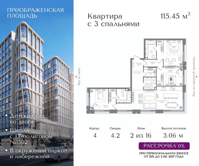 Рассрочка 0% от застройщика. Первоначальный взнос от 20%. Предложение действует до 31 января 2026 года Квартира на 3 этаже в жилом комплексе премиум-класса "Преображенская площадь". Общая площадь: 81.35 кв.м. Проект премиум-класса в историческом районе Москвы. До метро "Преображенская площадь" 3 минуты пешком. Квартиры сдаются без отделки и в свободной планировке, чтобы жители могли оформить пространство с учетом своей индивидуальности. Высота потолков от 3,15м, широкоформатное остекление, 3-5 квартир на этаже. Система Умный дом. Дизайнерские лобби. Внутренний двор 1,5 га функциональное и безопасное пространство для игр, работы и занятий спортом. Пешеходный променад для прогулок. Дома переменной этажности. Есть подземный паркинг. Жилой комлекс находится в окружении парков Сокольники, Черкизовский, Измайловский, заповедника Лосиный остров и ВДНХ, а также вблизи пешеходной набережной. Комфортная удаленность от центра: 7 минут на автомобиле до ТТК, 8 минут до Садового кольца, 25 минут до Кремля.