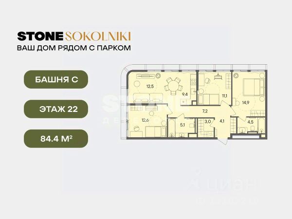 В продаже просторная и светлая квартира с кухней-гостиной и тремя спальнями в жилом комплексе бизнес+ класса СТОУН Сокольники. Идеально подойдет большим семьям: здесь личное пространство будет как у детей, так и у родителей. Проект расположен рядом с парком "Сокольники" в пешей доступности от метро. В нескольких километрах от комплекса находятся удобные выезды на ТТК и Садовое кольцо, обеспечивающие быстрый доступ в разные части Москвы. Транспортная доступность: - 10 мин. до м. "Сокольники" и "Электрозаводская" - 12 мин. до парка "Сокольники" - 2 км до ТТК - 6 км до Садового кольца Архитектурная концепция проекта разработана архитектурным бюро WALL. Жилой комплекс состоит из трех разновысотных башен с увеличенной площадью остекления, которая позволит насладиться городской панорамой и видами на парк "Сокольники". Планировки квартир в СТОУН Сокольники создавались с учетом разнообразия современных сценариев жизни в городе. В проекте предусмотрены просторные кухни-гостиные, изолированные мастер-спальни, планировки для семей с детьми разных возрастов. Благодаря грамотному зонированию можно насладиться как уединением, так и временем с семьей. В проекте СТОУН Сокольники большое значение придается бытовому комфорту будущих жителей: потолки высотой 3,1 м, расширенная торговая и социальная инфраструктура, собственный подземный паркинг и частный детский сад на закрытой территории. Во всех входных группах предусмотрены помещения для временного хранения СИМ, лапомойки, гостевые санузлы, а также комнаты матери и ребенка. На каждом этаже появятся колясочные для дополнительного удобства семей с маленькими детьми. STONE - девелопер коммерческой и жилой недвижимости классов бизнес и премиум в Москве с 19-летним опытом. С 2022 года занимает лидирующую позицию на офисном рынке (рейтинг РБК). Сегодня в портфеле девелопера представлено 3 млн кв. м построенных, строящихся и проектируемых объектов, из которых более 1 млн кв. м находятся в стадии строительства. Компания имеет самый масштабный проектный портфель офисной недвижимости класса А на московском рынке (данные NF Group) и возглавляет топ-6 устойчивых девелоперов согласно исследованию F Research от Forbes. В 2023 году частью стратегии по развитию компании стала диверсификация портфеля, в результате которой девелопер провел ребрендинг и запустил направления STONE Office и STONE Dom. В настоящий момент девелопером представлено 16 бизнес-центров класса А, а также 3 жилых комплекса бизнес+ класса. ID.16732
