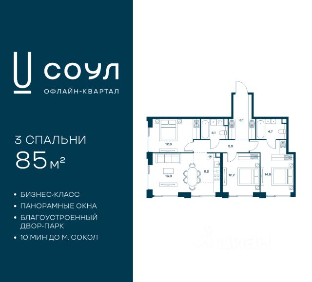 Квартира расположена в малоэтажной секции — всего 9 этажей. Это редкость для премиум-класса: меньше соседей, меньше шума, меньше ожидания лифта. Утро начинается спокойно, без суеты. В секции такой планировки осталась только одна квартира — уникальное предложение. При этом 80 % квартир в комплексе уже продано, что подтверждает высокий спрос и престиж проекта. Квартира продаётся без отделки, что позволяет создать интерьер под свой вкус. Просторные 84 м² дают возможность спроектировать удобную и современную планировку: кухню-гостиную с панорамными окнами (окна во двор на северо-восток - солнце с утра) , мастер-спальню с ванной и гардеробной, вторую спальню, гостевой санузел и просторную прихожую. Здесь всё начинается с вашей идеи — от планировки до материалов, освещения и цвета стен.